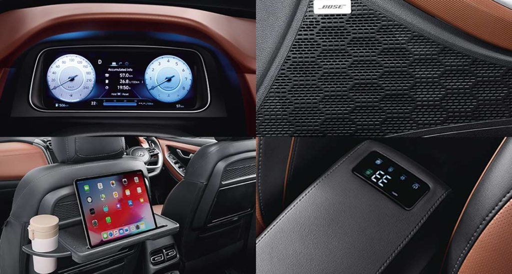 Features in the cabin include a dual-tone cognac brown theme, 8-way power-adjustable driver seat, tilt & telescopic steering wheel, a 10.25-inch digital driver display, a 10.25-inch central touchscreen, Apple CarPlay & Android Auto connectivity, voice commands, auto AC, AC vents for 2nd & 3rd row, USB charging ports, wireless smartphone charging pads, an 8-speaker Bose audio system, and 64-colour ambient lighting. The Alcazar also claims a few segment-first features including an air purifier with AQI display (air quality index); seatback tables with retractable cup and tablet device holders; and rear window sunshades.