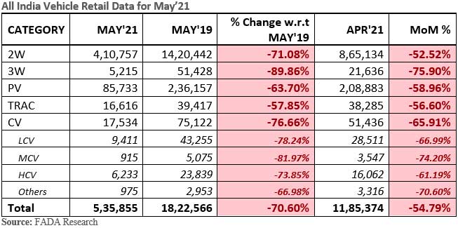 The Federation of Automobile Dealers Associations (FADA) has published May 2021 vehicle retail data which shows a decline of over 70% compared to May 2019. Since the entire nation was under complete lockdown in May 2020, the comparisons are with May 2019. The Passenger Vehicle segment, in particular, registered a decline of over 63% last month compared to May 2019.