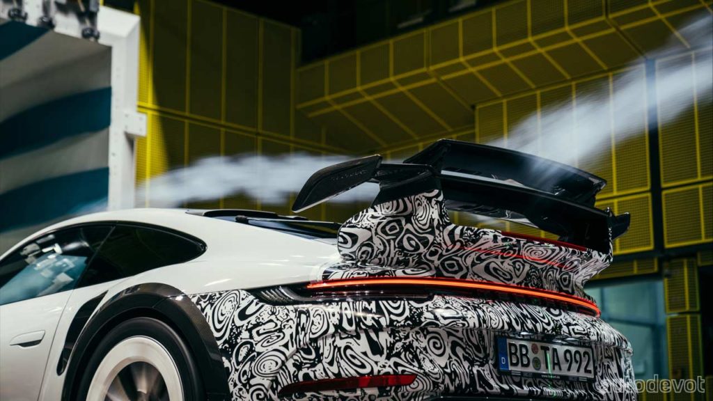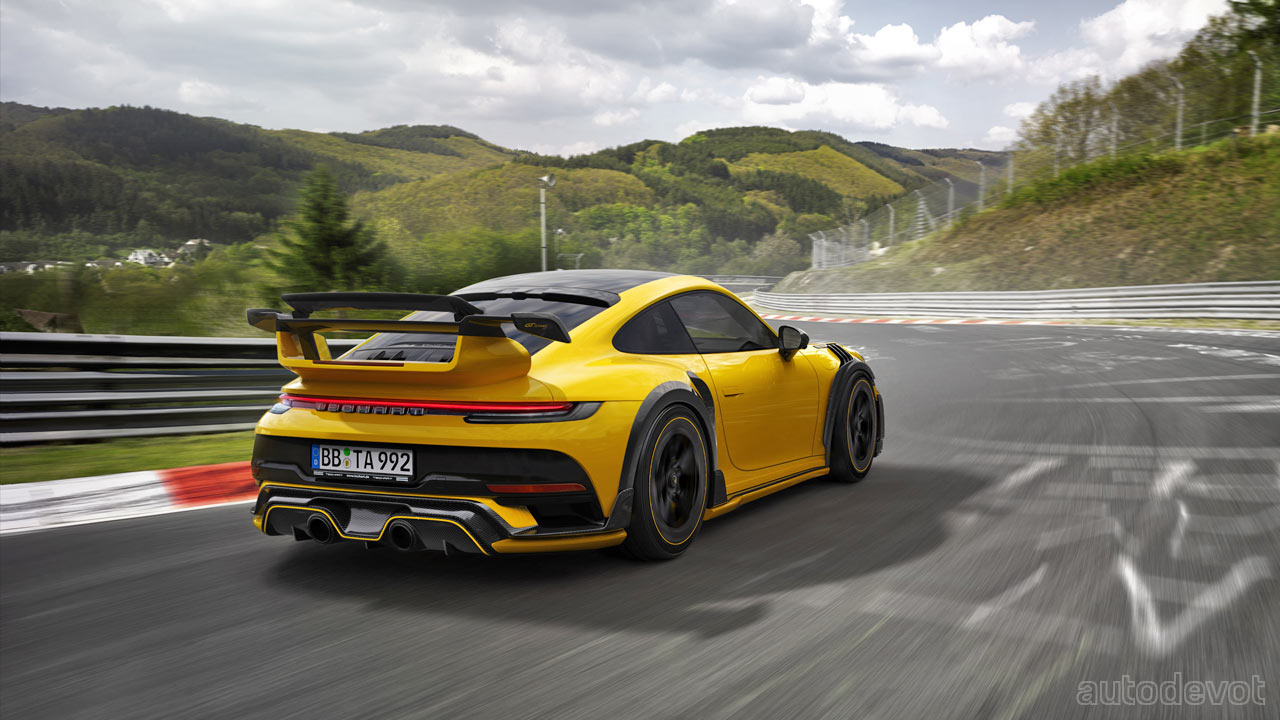 The new GTstreet R is based on the 992 series 911 Turbo and Turbo S models, and not on the new GT3. However, it does get GT3-esque bonnet vents; the entire bonnet is made of carbon fibre. In fact, the entire car is adorned with carbon fibre aero elements which according to Techart, generates four times more downforce on the rear axle and 45% less lift on the front axle at 140 km/h (87 mph) compared to the series production model. While the rear wing is just as impressive as the one on the GT3, its design is inspired by those on the past Porsche racing models.