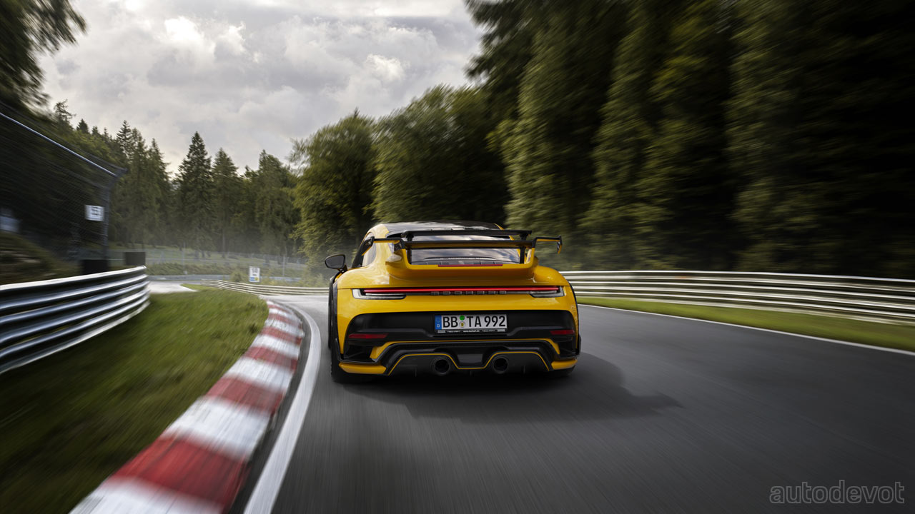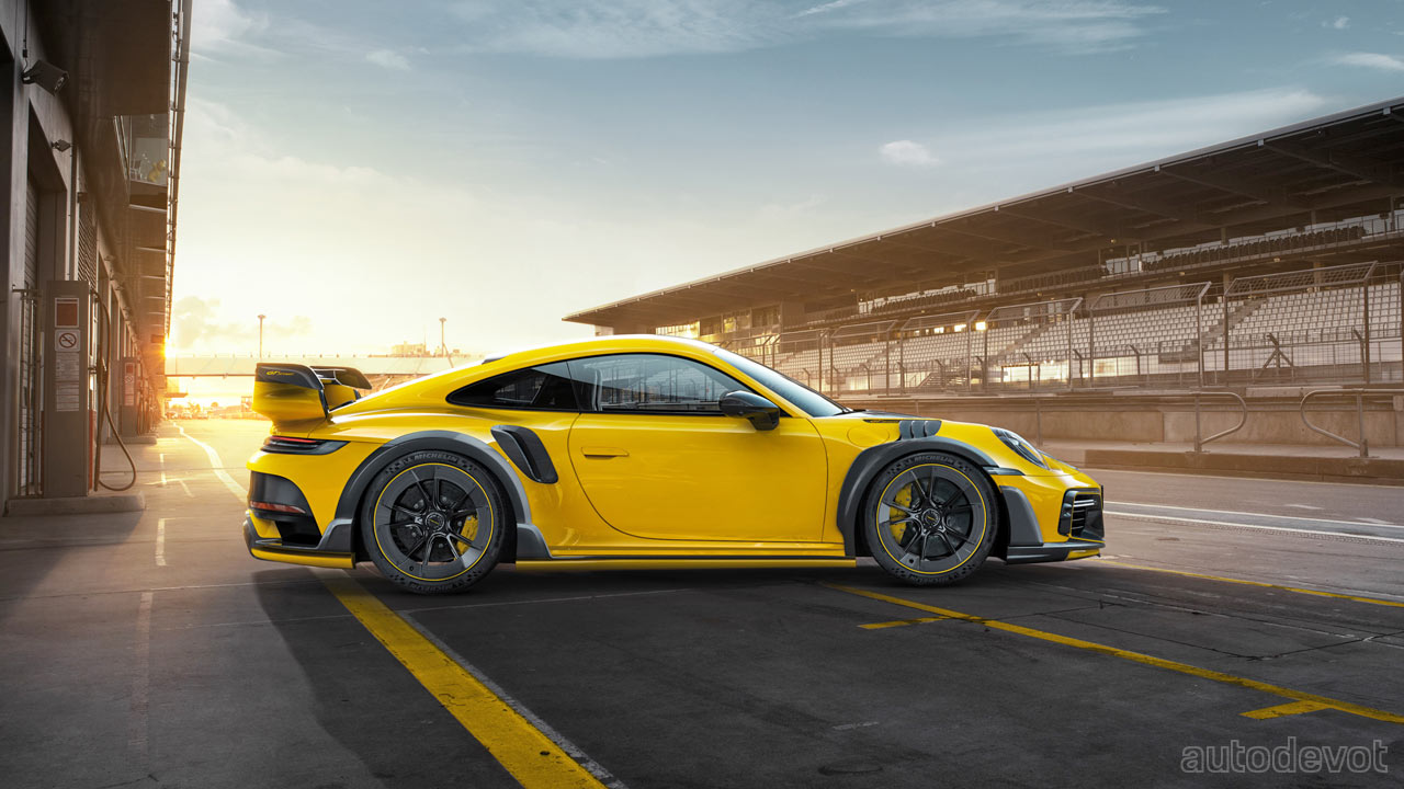 A performance upgrade named TA092/T1.1 extracts an additional 44 kW (60 metric hp) and 100 Nm (74 lb-ft) from the 3.8L twin-turbo flat-six, which brings the total to 522 kW (710 metric hp) and 900 Nm (664 lb-ft) compared to the Turbo S. For those who want even more, there’s another upgrade named TA092/T2.1, which includes new turbochargers in addition to a new ECU software, which take the output figures to 588 kW (800 metric hp) and 950 Nm (701 lb-ft). The new top speed in this case is 350 km/h (217 mph).