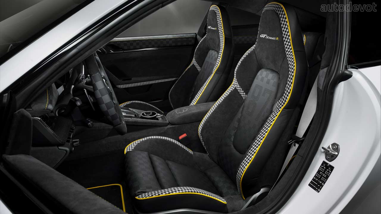 The cabin too features a generous application of carbon fibre, and of course, Alcantara. The yellow pinstriping from the exterior has been mimicked inside — on the floor mats and seats, which I think looks really tasteful. There’s a chequered flag theme going on in the cabin, which can be noticed not only on the seats but also on the dashboard, steering wheel and on the door cards as well. The seats feature perforated ’87’ on the centre section, indicating the limited number of kits Techart is planning to build. The upcoming Clubsport Package also includes a roll cage.
