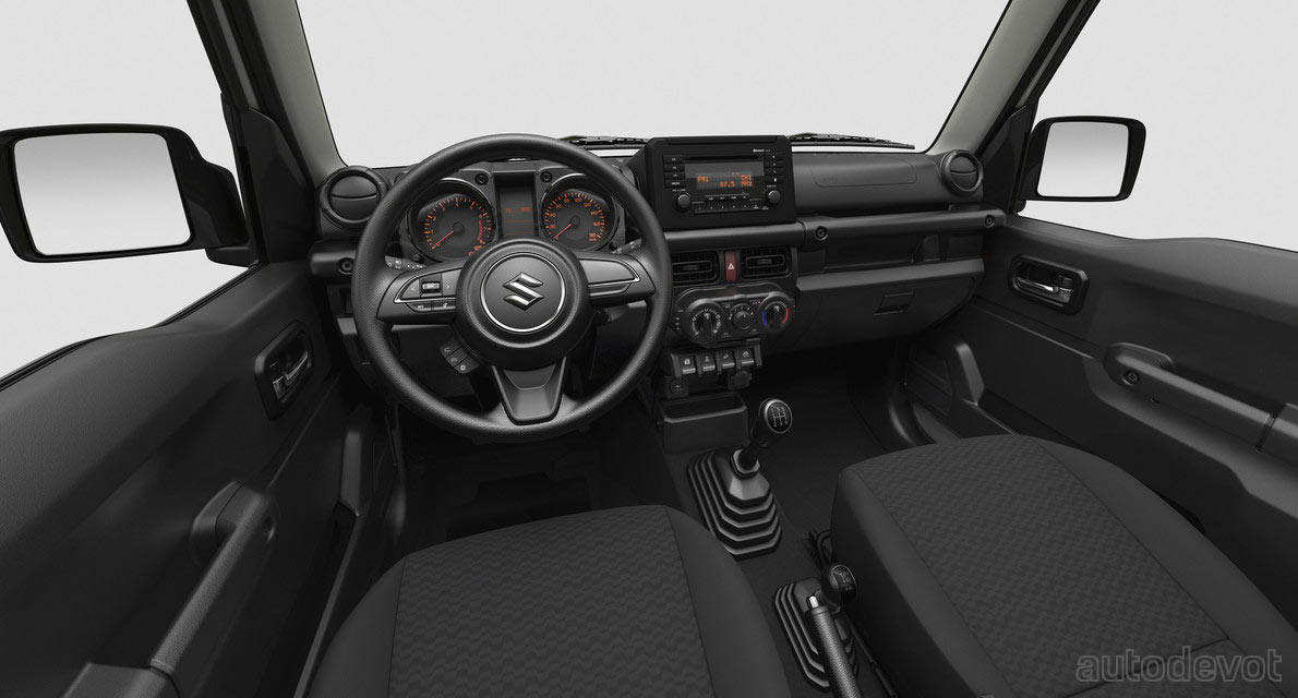 So, what’s this “Jimny Lite” all about? Well, it’s basically a base model of the regular Jimny (Jimny Sierra), if you will. As the name suggests, Suzuki has deleted some features to make it lighter on your bank account. These include halogen projector headlights as opposed to LEDs, no standard fog lamps, and 15-inch steel wheels. Inside, there’s not gonna be a touchscreen but a Radio/CD player with Bluetooth connectivity; and a manual AC as opposed to climate control in the regular model.