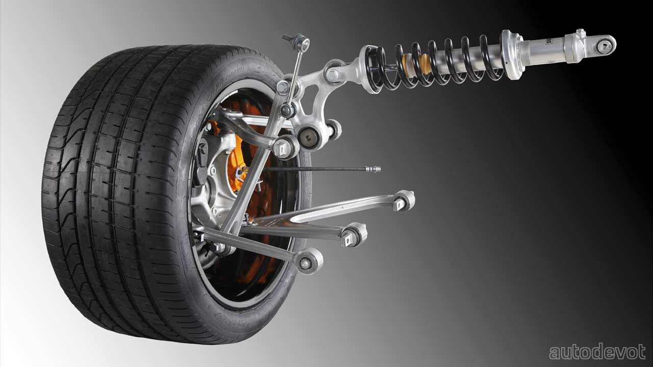 The Aventador debuted with a rather unusual suspension setup for a road car — a push-rod system. Borrowed from Formula 1, the system features rods attached to the lower part of the hub housing of each wheel, which transmit (push) the force to the shock absorber-spring assemblies fitted horizontally in the upper part of the frame, at both the front and rear.
