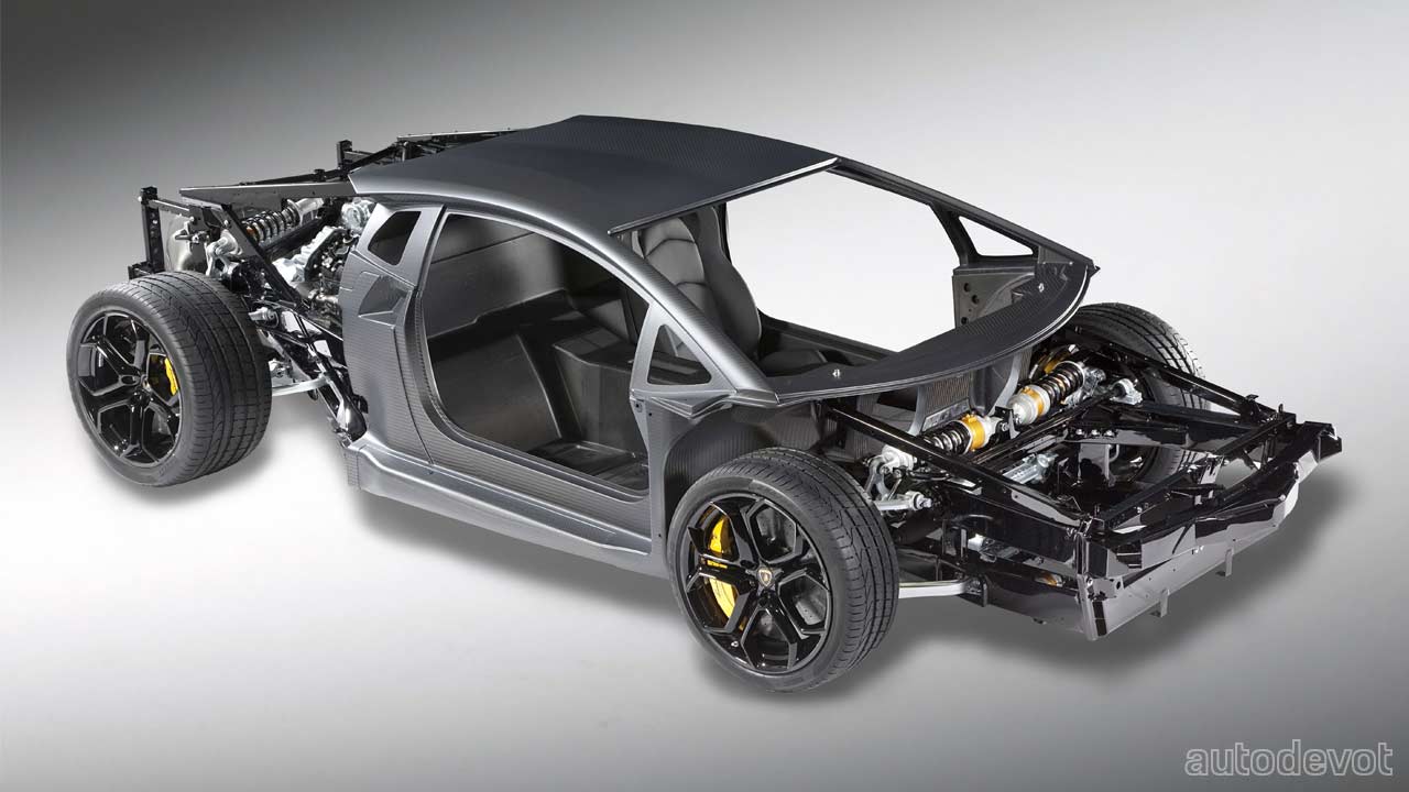 Besides that N/A V12, the Aventador LP 700-4 owes its success to its carbon fibre monocoque, built using Lamborghini’s patented technologies. Together with the front and rear aluminum sub-frames, the Aventador’s chassis weighed only 229.5 kg (506 lbs). The monocoque was modified for the Roadster version which arrived in 2013. Each of the two carbon fibre removable roof sections weighed only about 6 kg (13 lbs).