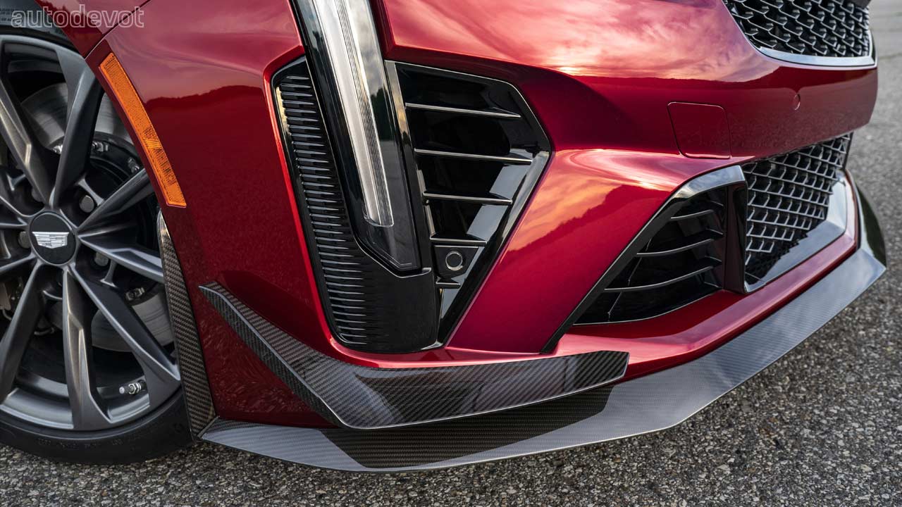 Cadillac said that these aero elements were refined using advanced Computational Fluid Dynamics and were put through 500 hours of wind tunnel testing. The aero components include front splitter; front dive planes; model-specific front grille with each V tuned to optimize airflow; fender vents; underbody air strakes; flat underbody panels; a rear spoiler with a 3 mm Gurney flap, and rear control arm covers to prevent air from building up around rear wheel well. The carbon fibre package #2 includes rocker extensions and a rear diffuser.