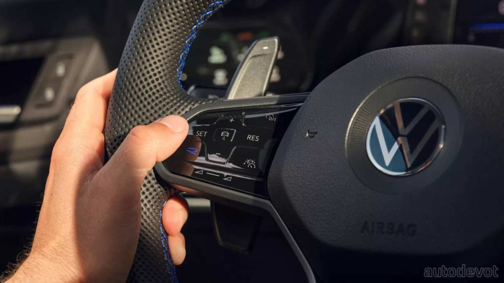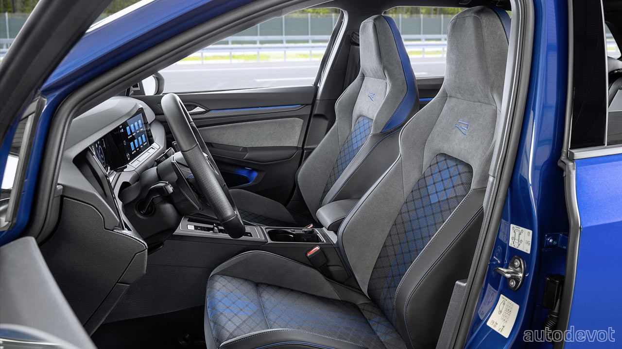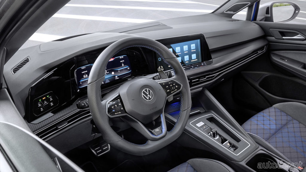Inside, you get a multifunction sports steering wheel with a dedicated R button, and R-branded premium sports seats at the front with seat centre panels in black-blue fabric. The optional Nappa leather package adds active climate control for the front seats.
