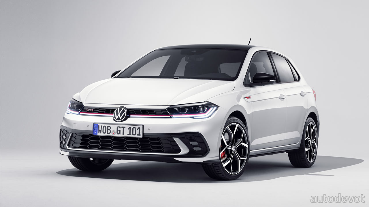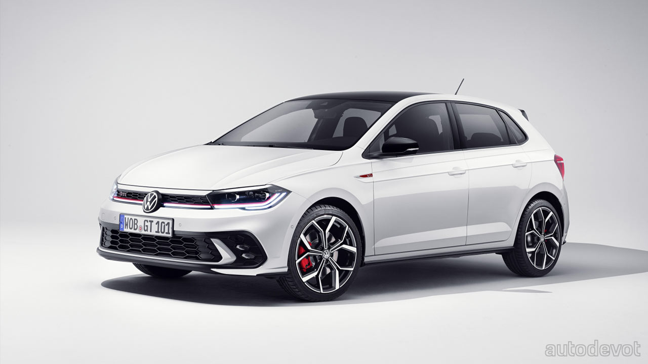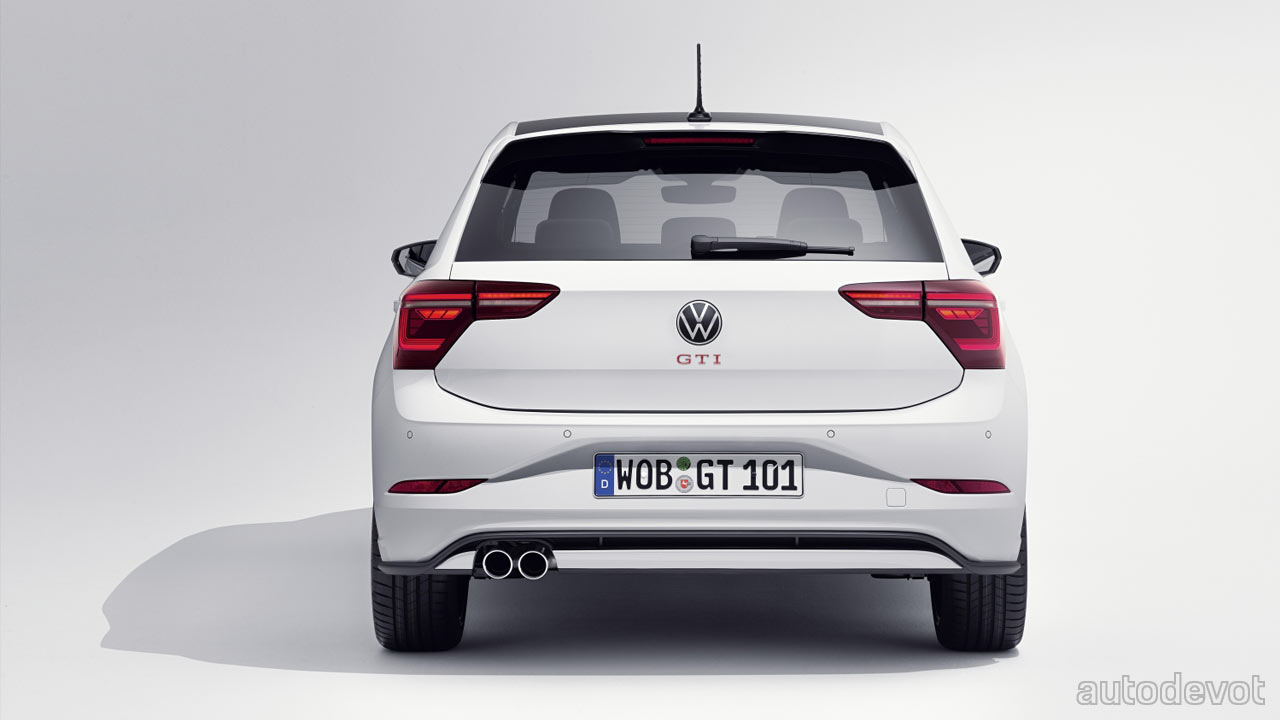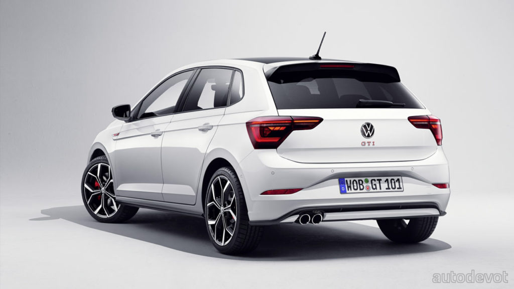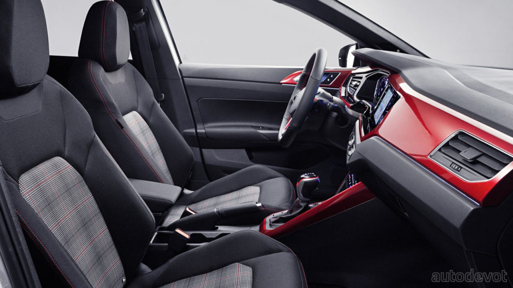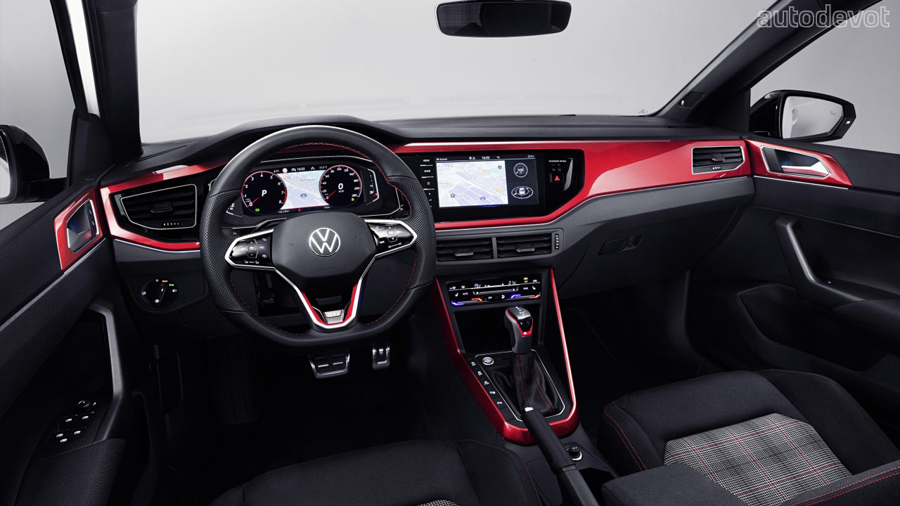 The cabin has been spiced up with red on the dashboard and centre console in this particular example; notice that the red also flows around the door handles. Other features include a GTI-branded sports steering wheel with touch controls; and standard sport seats with ‘Clark’ checked fabric upholstery and red contrast stitching. Sport comfort seats are available in the options list. The rest of the stuff has been carried over from the regular Polo, including an optional 10.25-inch Digital Cockpit Pro; the latest generation (MIB3.1) 9.2-inch infotainment system; wireless Apple CarPlay & Android Auto connectivity, and the optional IQ.Drive Travel Assist. A 6-speaker Beats audio system is also optional.