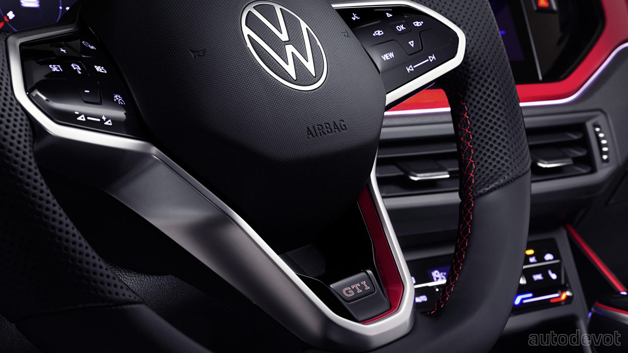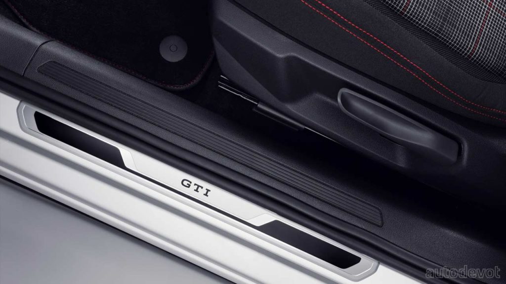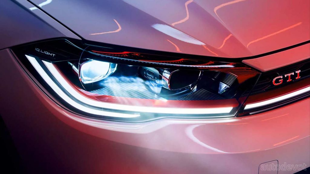 As we saw in the teaser a month ago, the new GTI gets a sporty front bumper with a honeycomb pattern and honeycomb-shaped running lights; a red strip that runs over the top LED strip; a GTI badge on the front wings/fenders; a black rear spoiler, chrome-plated tailpipes, and standard 17-inch ‘Milton Keynes’ rims hiding the red-painted calipers. Buyers can go for the optional 18-inch ‘Faro’ rims. The IQ.Light — LED matrix headlights come standard. The model-specific sports chassis lowers the ride height by 15 mm.