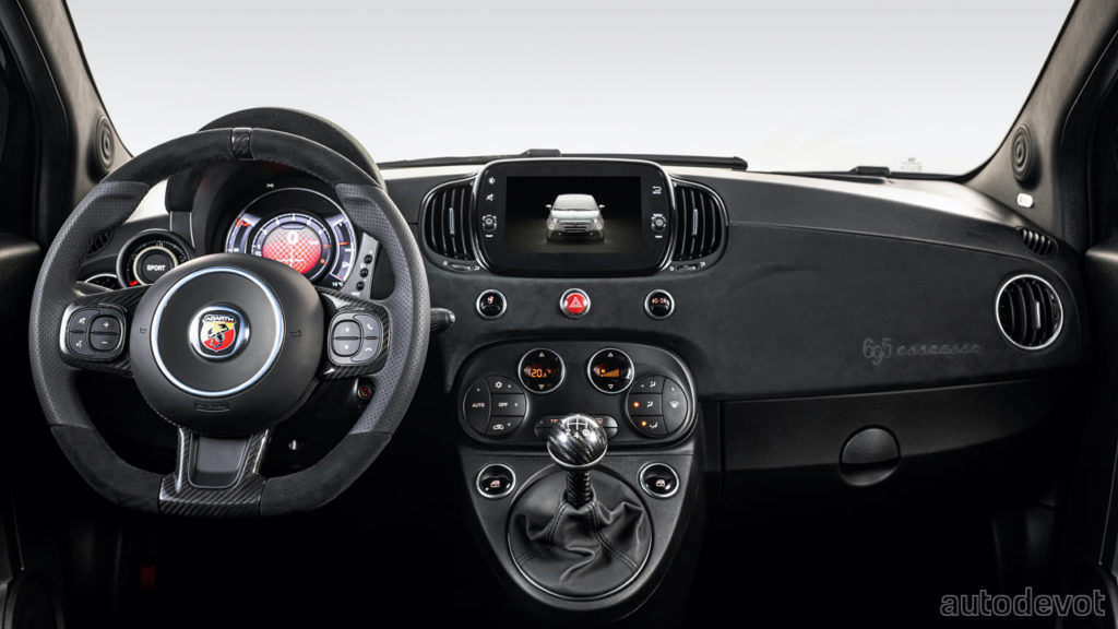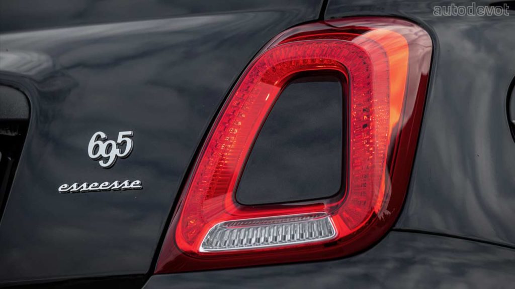 As for the juicy bits, the 1.4-litre (1,368 cc) 4-cylinder T-Jet turbocharged petrol engine pumps out the same 132 kW (180 metric hp) and 250 Nm (184 lb-ft) of torque as in the 695 70° Anniversario. The engine is paired with a 5-speed manual gearbox. The official performance figures are identical too: a 0-100 km/h (62 mph) sprint time of 6.7 seconds and a top speed of 225 km/h (140 mph); the latter is with the spoiler set to 0°. Koni FSD shock absorbers round off the 695 Esseesse.