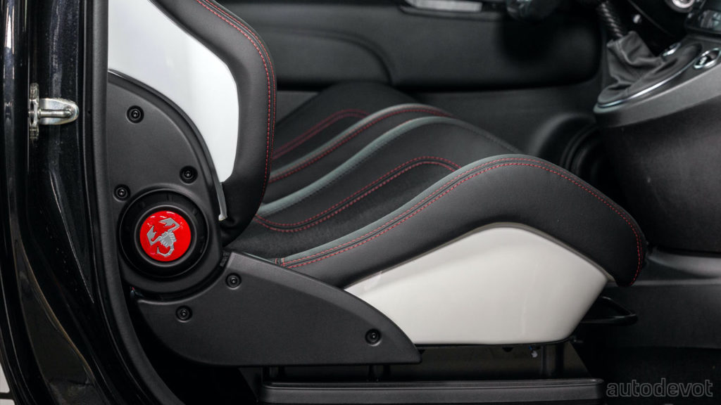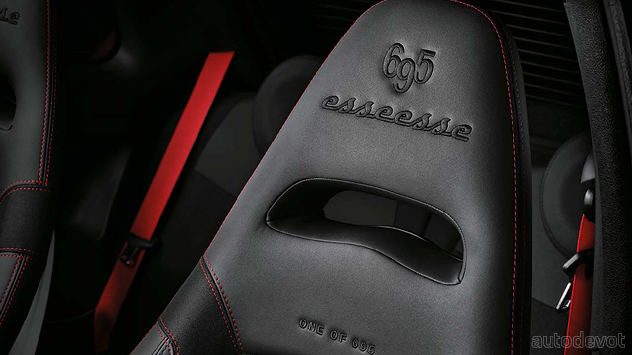 Inside, the dashboard features Alcantara with 695 Esseesse branding, while the steering wheel and gear lever feature carbon fibre accents. The Sabelt seats with red contrast stitching also feature the 695 Esseesse branding in addition to ‘one of 695’ wording.