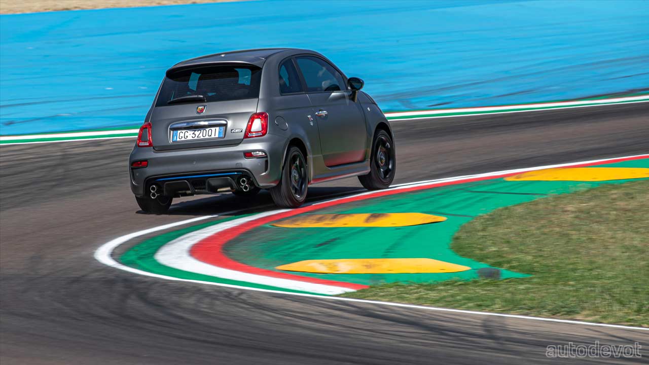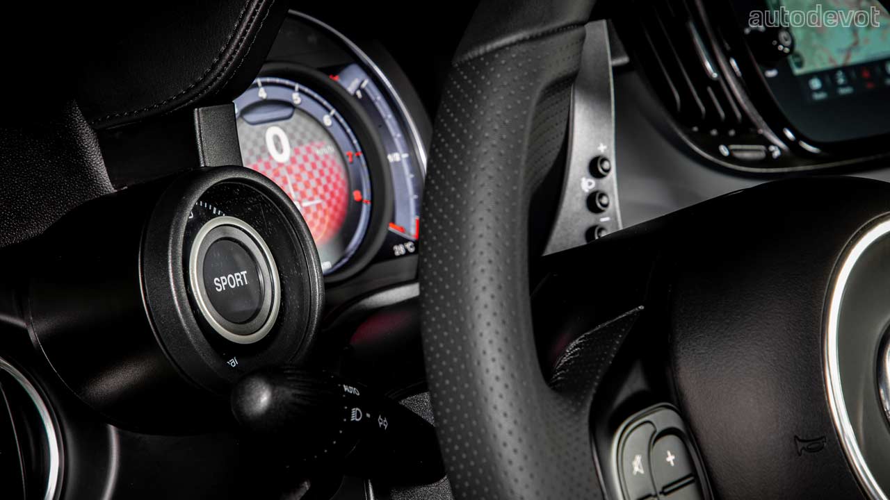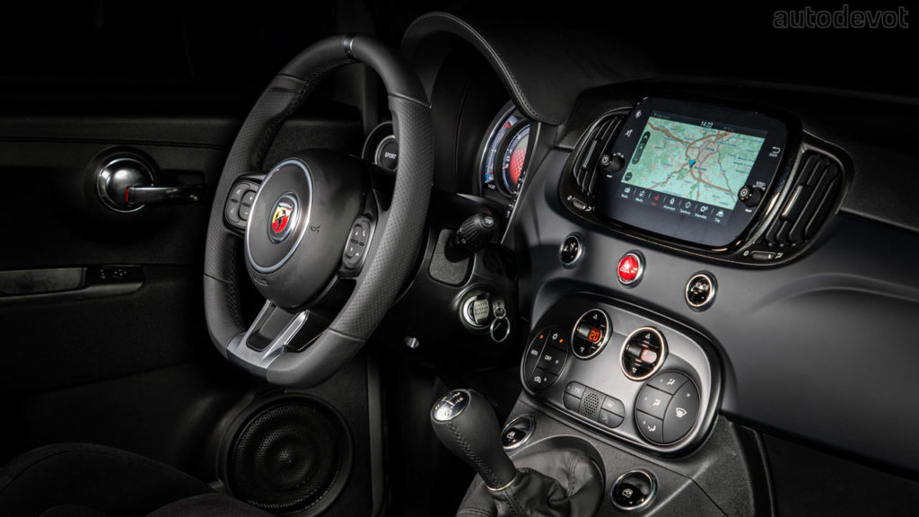 Let’s talk about the business-end then. The 1.4L T-Jet engine forms the basis for the propulsion unit in the Tatuus single-seaters used in the Italian and German Formula 4 championships. For the F595, the engine is blown by a Garrett turbo with a geometric compression ratio of 9:1, delivering 121 kW (165 metric hp) and 230 Nm (170 lb-ft) of torque. The engine can be paired with either a 5-speed manual or a 5-speed AMT. With the manual, a 0-100 km/h (62 mph) sprint is claimed to take 7.3 seconds. The top speed is claimed to be 217 km/h (135 mph).