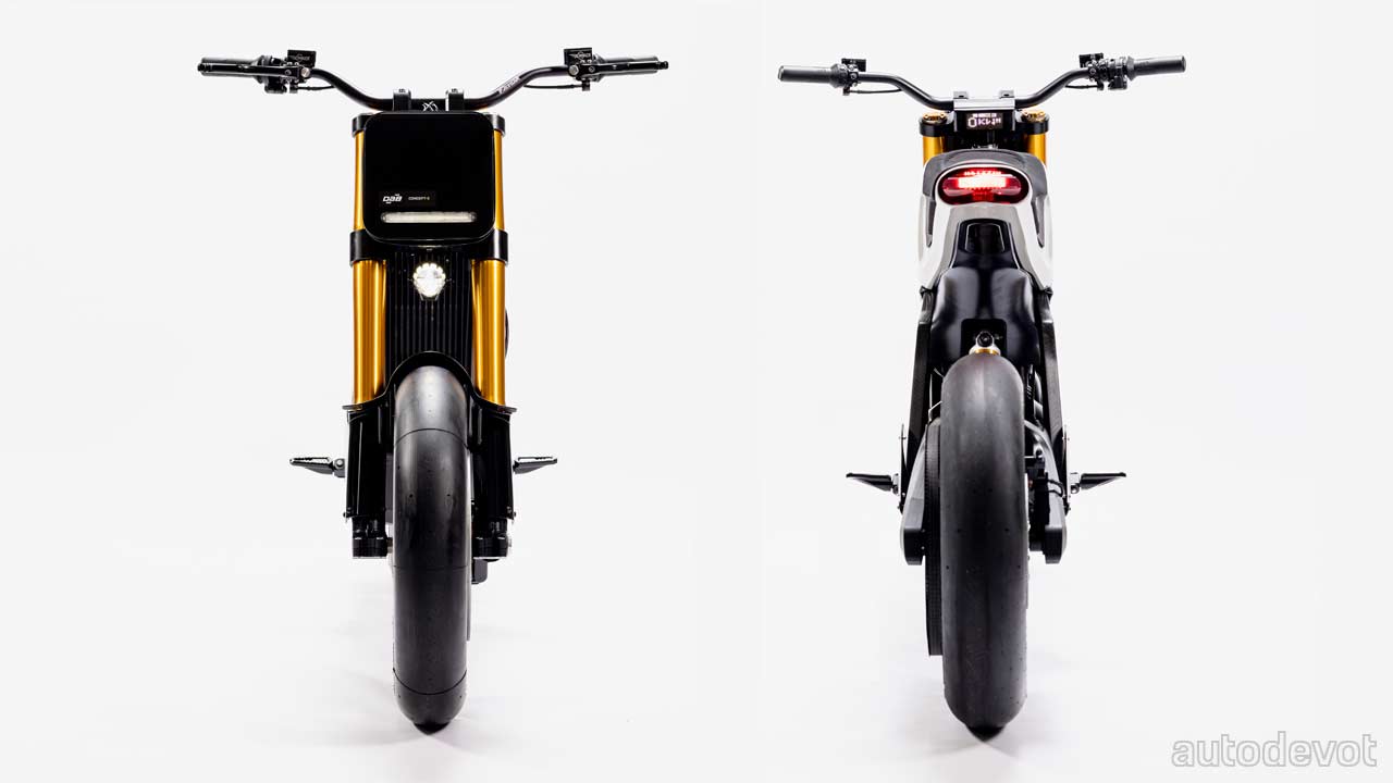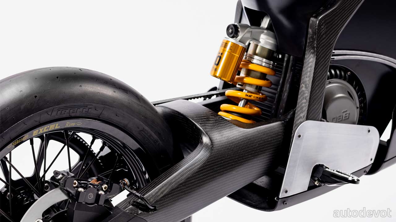 The Concept-E too follows a similar, minimalistic theme with a thin, rounded-rectangular-panel for the LED running light, and LED speedometer; you can literally count the number of LEDs in the speedometer. That black panel upon which the speedometer sits, is actually a lid for a small storage. The main headlight is sort of “hidden” between the front fork. The motorcycle uses carbon fibre for the frame and swingarm. Other features include bespoke Öhlins suspension, Beringer aluminium brakes, and Gates belt drive with aluminium pulleys. The saddle is made from Ripstop, which as the name suggests, is resistant to tearing and ripping.