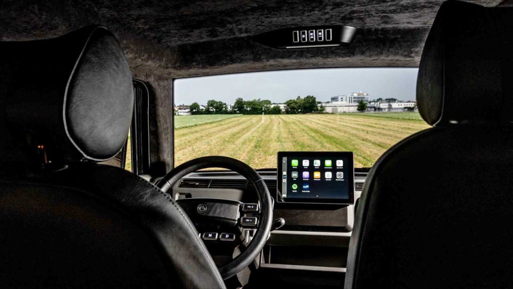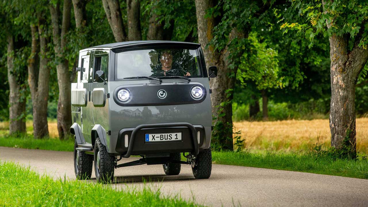 Notice the negative camber in the rear axle for better stability and handling. Anyway, legally, the XBus is not classified as a traditional automobile in Europe; it belongs to the ‘L7e‘ class, which stands for heavy quadricycles. Inside, it’s not all barebones though, you get a 10.2-inch display, a multifunctional steering wheel, and an audio system. Air conditioning, reversing camera, and even brushed aluminium panels are available in the options list. Safety systems include ABS and ESP.