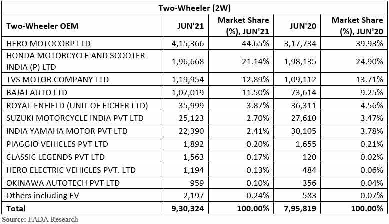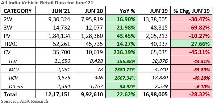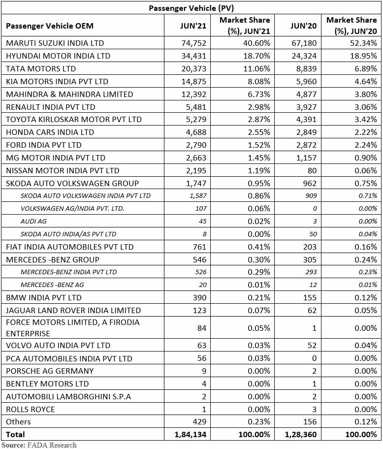 The Federation of Automobile Dealers Associations (FADA) has published June 2021 vehicle retail data, which shows a total growth of nearly 23% compared to June 2020 data. The Passenger Vehicles segment, in particular, registered a growth of nearly 43.5% last month compared to June 2020.