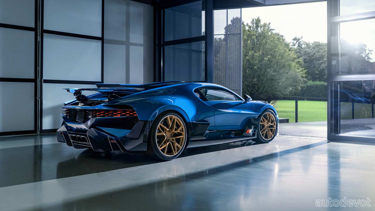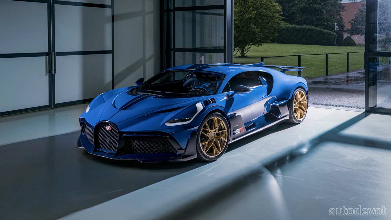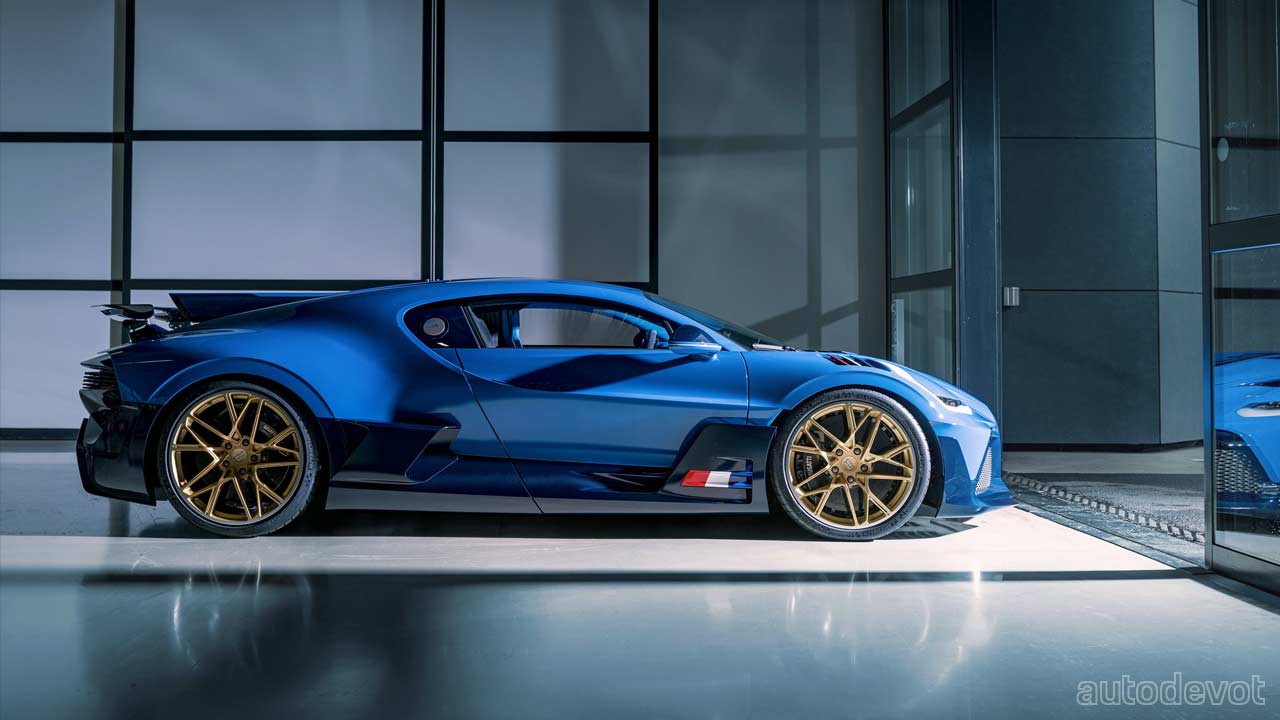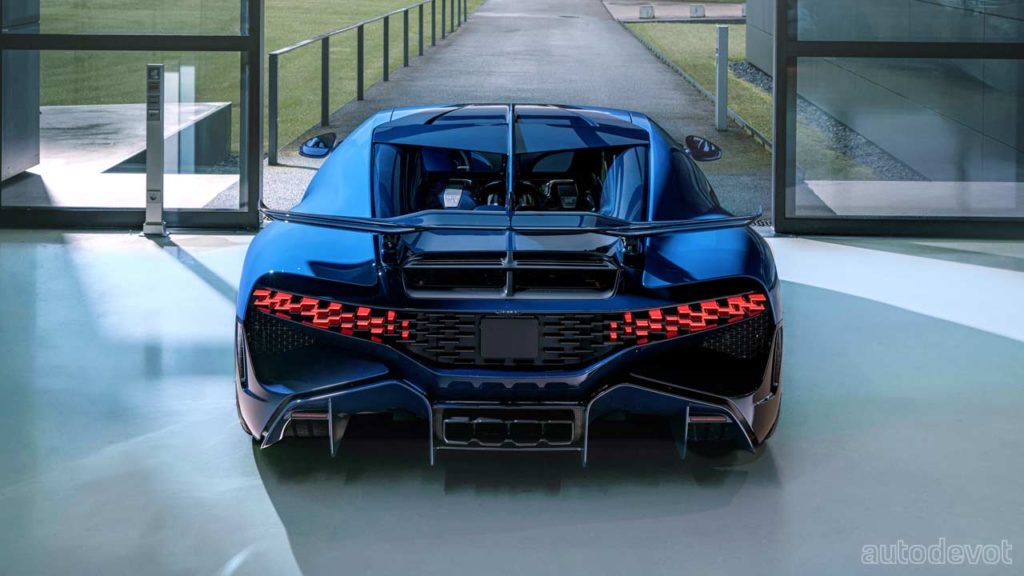 Speaking of which, the primary color on the exterior is called Bugatti EB 110 LM Blue, which is a homage to Bugatti’s last Le Mans factory race car. The remaining, exposed carbon bits are tinted dark blue, adding the necessary contrast. In fact, the paint job reminds me of the Bugatti Vision Gran Turismo. Also, notice the French flag on those fins behind the front wheels, which is probably one of the very few identical styling elements on all Divos.