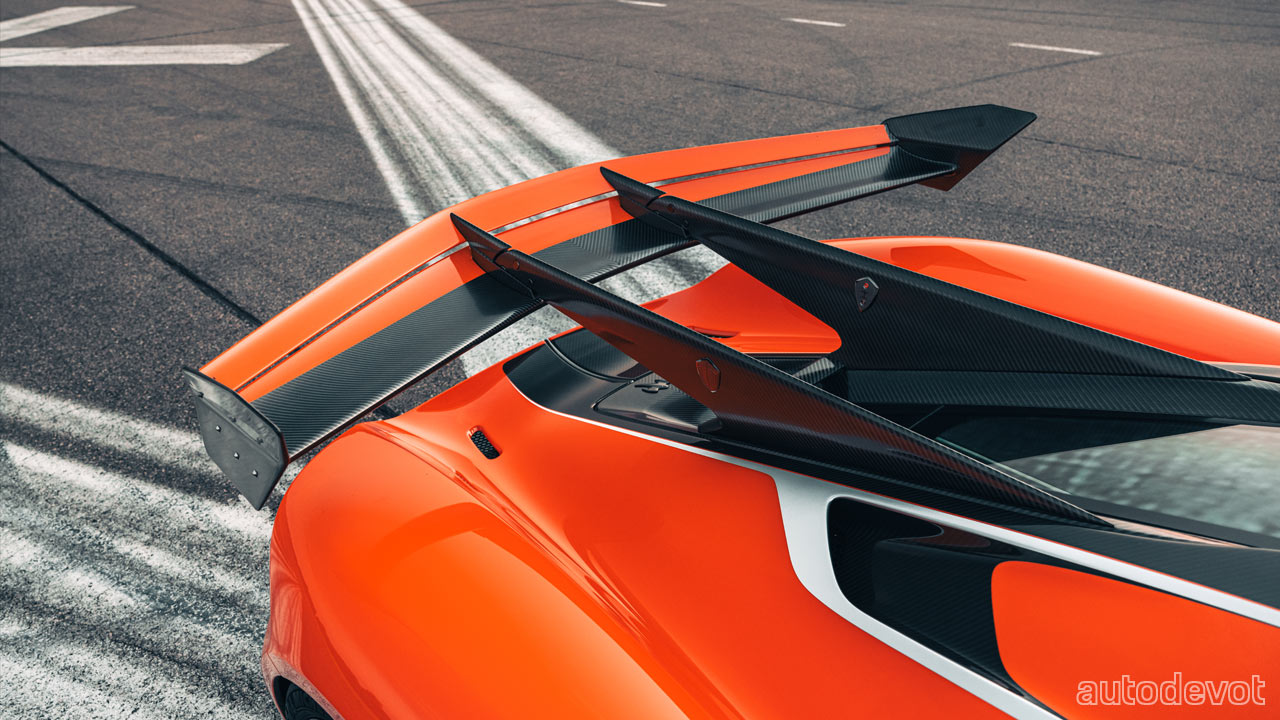 Besides the bright paintwork, visually, the production model doesn’t look any different compared to the original 2019 prototype, which is, of course, a good thing. All the elements including the large front splitter, the dive planes, the large bonnet vent, the massive side intakes next to the door, and the active double-profile rear wing, have been retained.