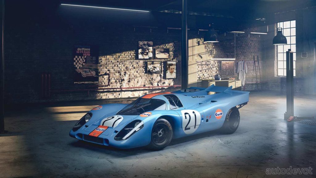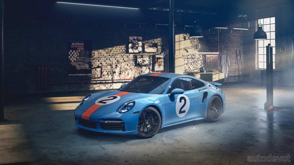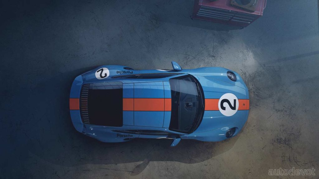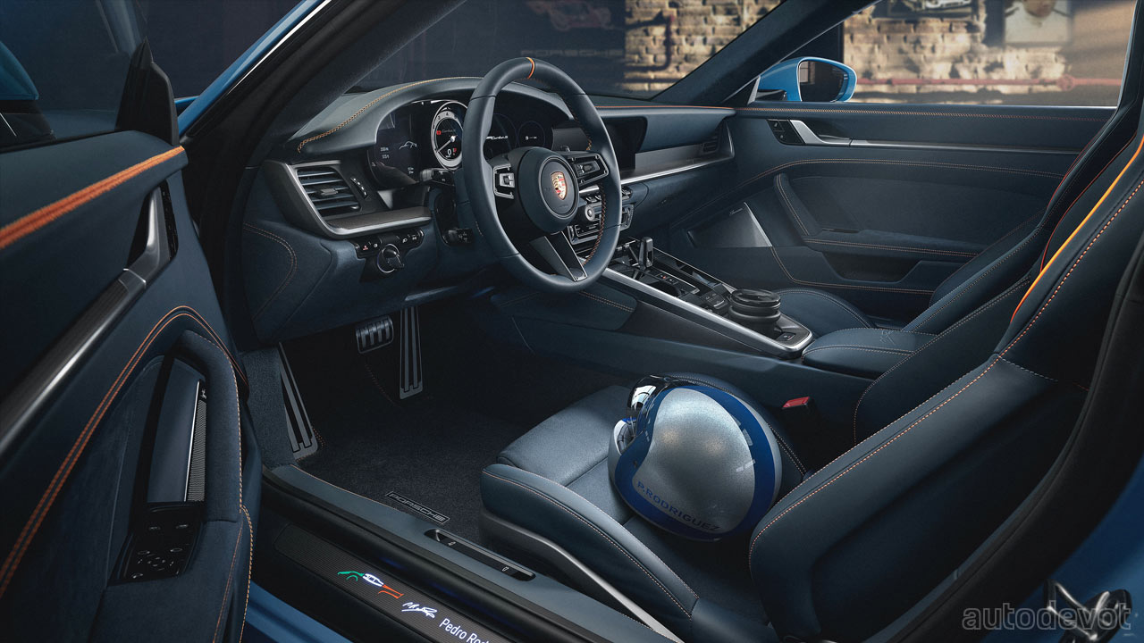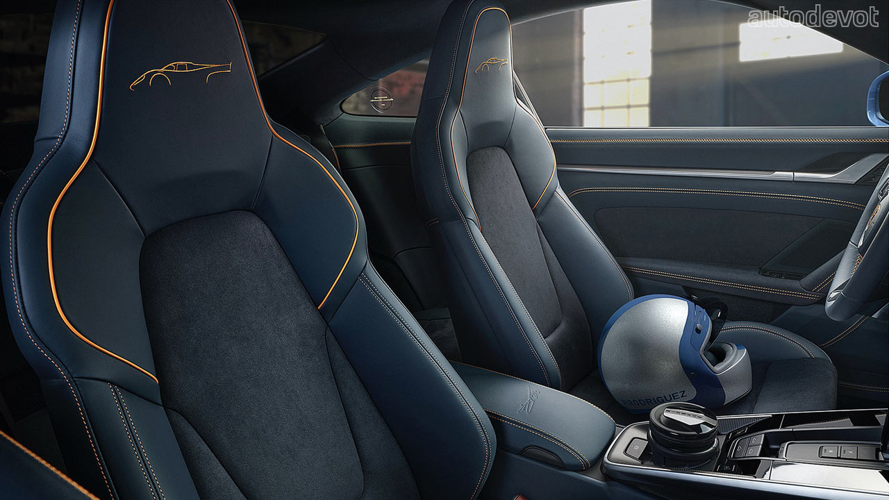 Eight of his 11 wins were in the Porsche 917 KH, which are engraved under the rear spoiler of the tribute car. The tribute car wears a similar Gulf livery as the 917 KH, complemented with high-gloss black-painted wheels. The number two alludes to his two world endurance championships. The cockpit features graphite blue leather upholstery with orange contrast stitching and details; notice the 917 silhouette on the integrated headrests. Rodríguez’s signature can be seen on the centre armrest and on the carbon fibre dashboard trim. The car also comes with a bespoke luggage set in graphite blue leather with orange stitching.
