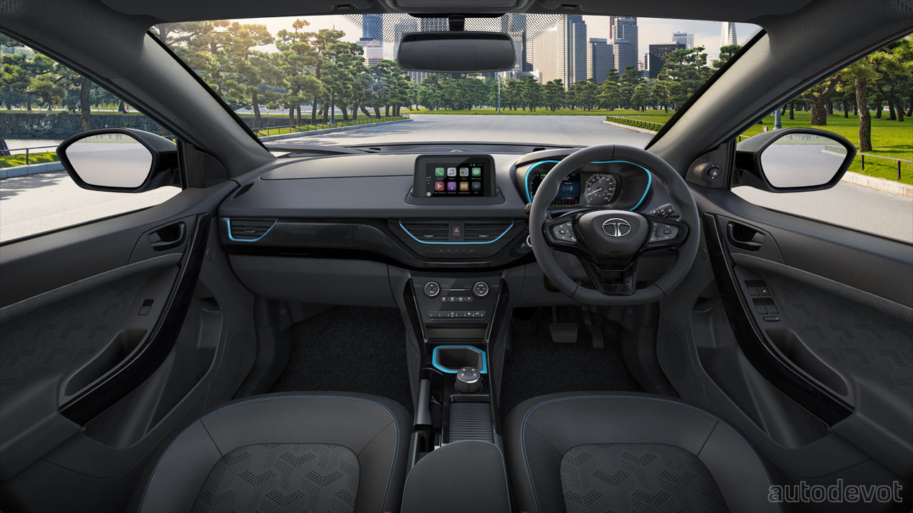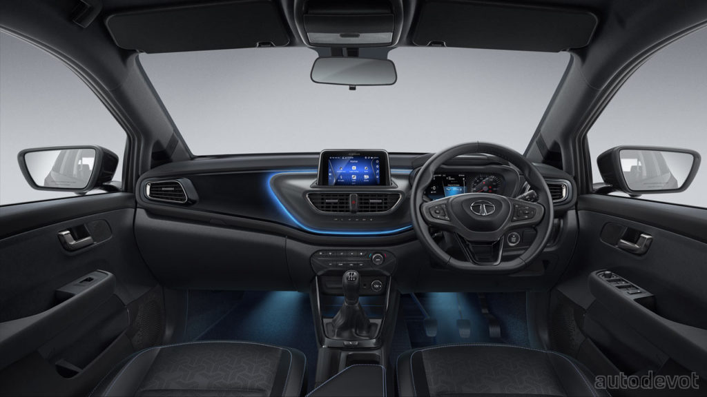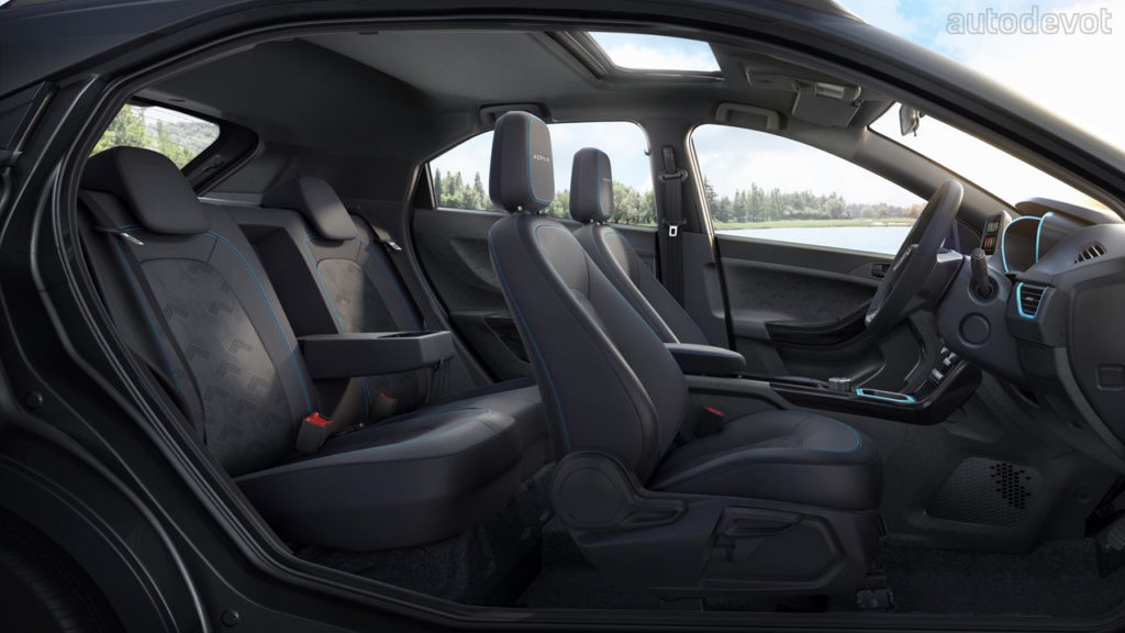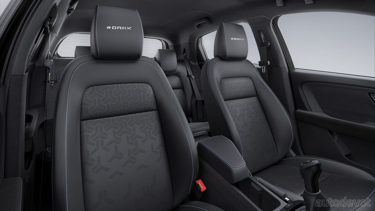 Inside, the dashboard features a tri-arrow pattern and piano black appliques; premium leatherette seats with tri-arrow perforations, blue contrast stitching, and “#Dark” embroidery on the front headrests; leatherette wrapped steering wheel; and a tri-arrow theme on the door cards.