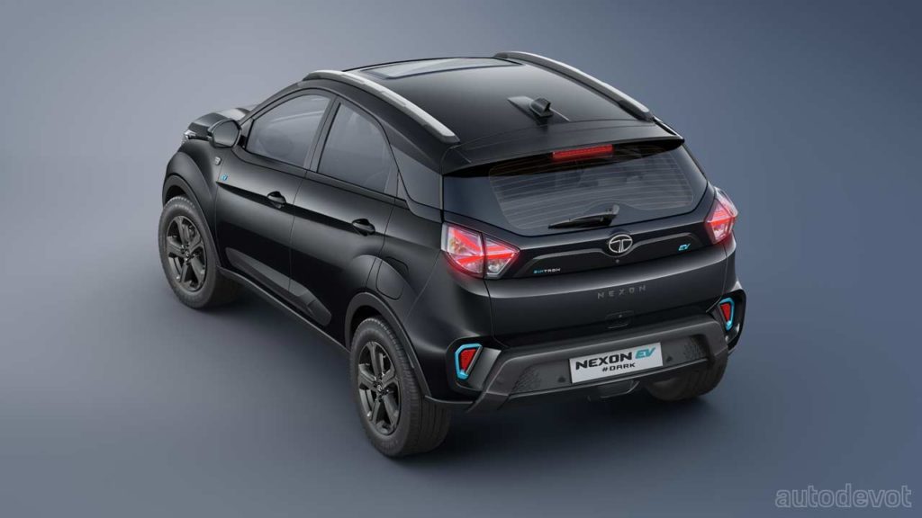 Next up is the Nexon EV Dark, available in the top two trims: XZ+ and XZ+ LUX. Prices start at INR 15.99 lakh, ex-showroom, Delhi. This one too gets a similar treatment as its ICE-powered sibling. The exterior paint is called Midnight Black, complemented with Satin Black humanity line and beltline, and 16-inch Charcoal Grey alloy wheels. Those EV-exclusive subtle blue highlights have been retained as is.