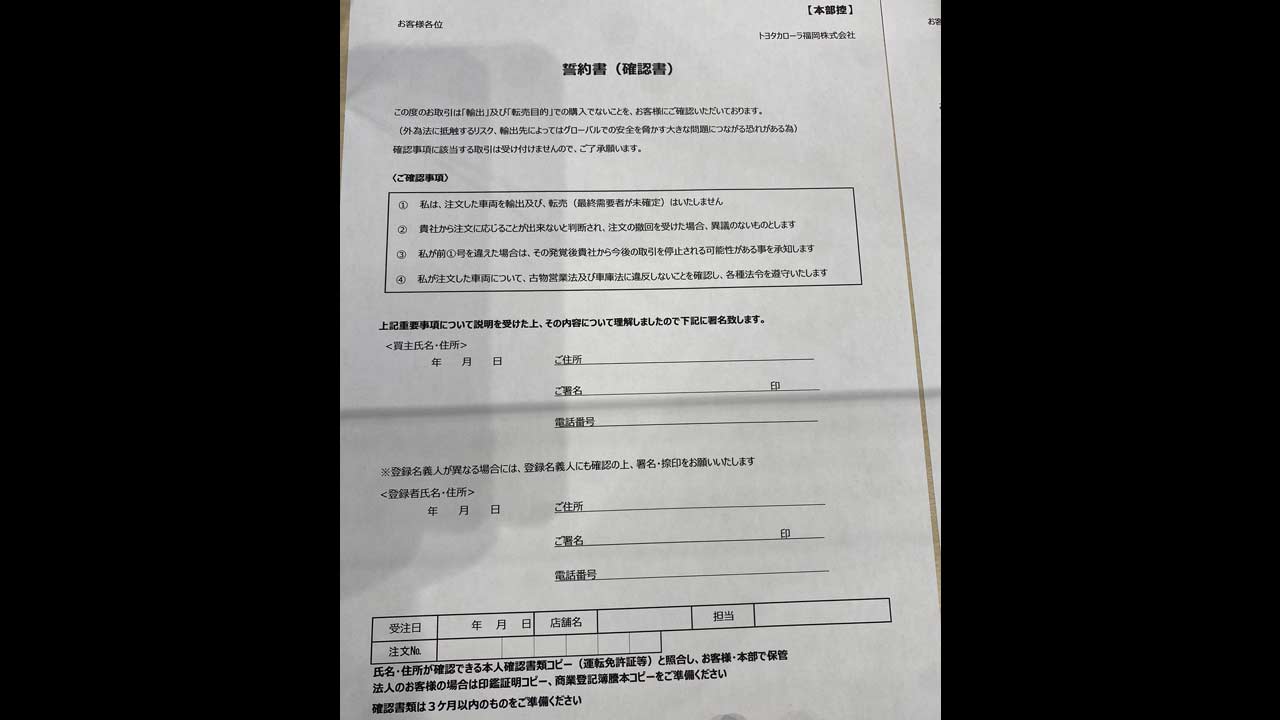 We are also aware that if the situation were to develop to the point where a Toyota dealership was to be investigated on suspicion of involvement in a violation of the Foreign Exchange and Foreign Trade Law (Foreign Exchange Law), it would be a major problem not only for the Toyota dealership in question but also for all Toyota dealers and Toyota Motor Corporation.