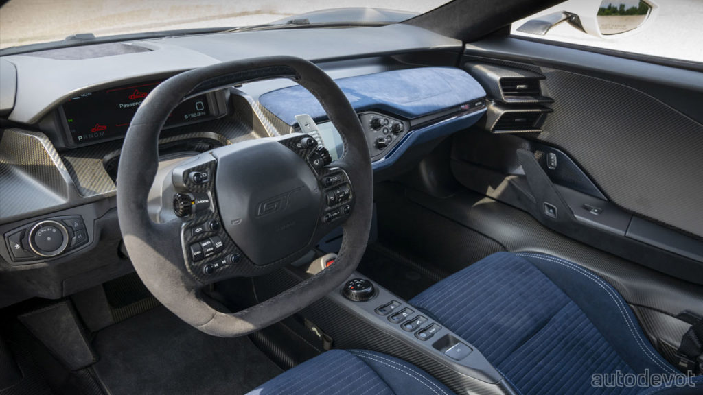 This is not a goodbye edition though; rumour has it that a more powerful version is in the works. But anyway, as you can see, the GT ’64 Heritage Edition wears a livery similar to the original car, with a combination of Wimbledon White paint with Antimatter Blue contrast touches. The front splitter, rocker panels, engine vent surrounds and rear diffuser, are all in exposed carbon fibre. The wheels too are made of carbon fibre but are painted in Antimatter Blue.