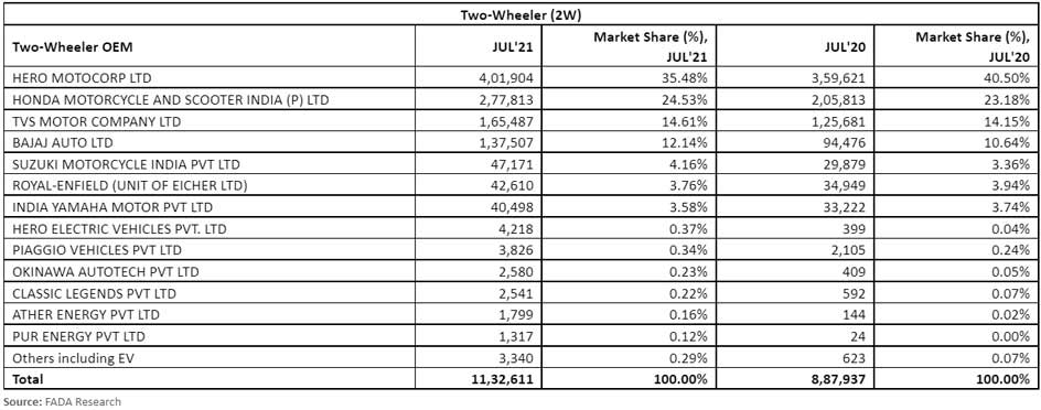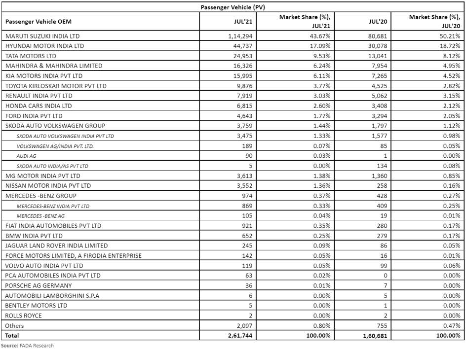 The Federation of Automobile Dealers Associations (FADA) has published July 2021 vehicle retail data, which shows a total growth of just over 34% compared to July 2020 data. The Passenger Vehicles segment, in particular, registered a growth of nearly 63% last month compared to July 2020. Also, Mahindra and Kia continue a fierce battle for 4th place.