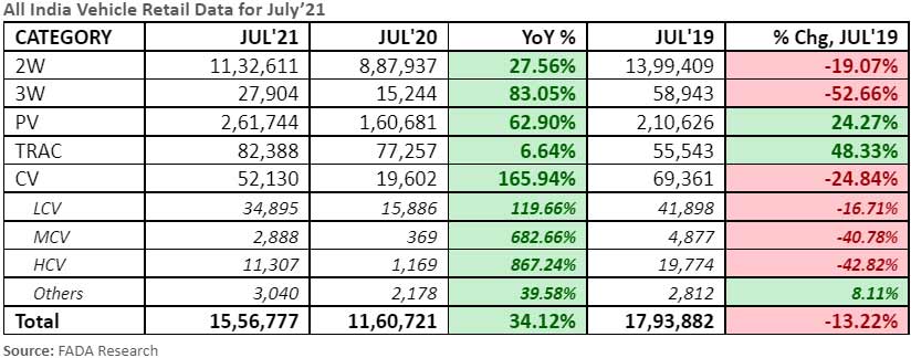 The Commercial Vehicles segment continues its triple-digit growth with nearly 166% growth in July 2021 compared to the same period last year. The three-wheeler segment also appears to be doing a great job, thanks to the sudden rise of online retailers. FADA President Vinkesh Gulati had the following to say –