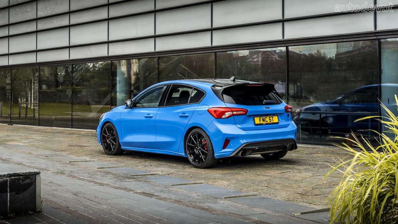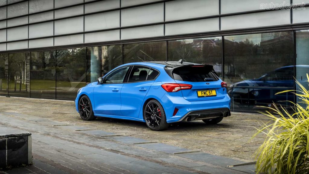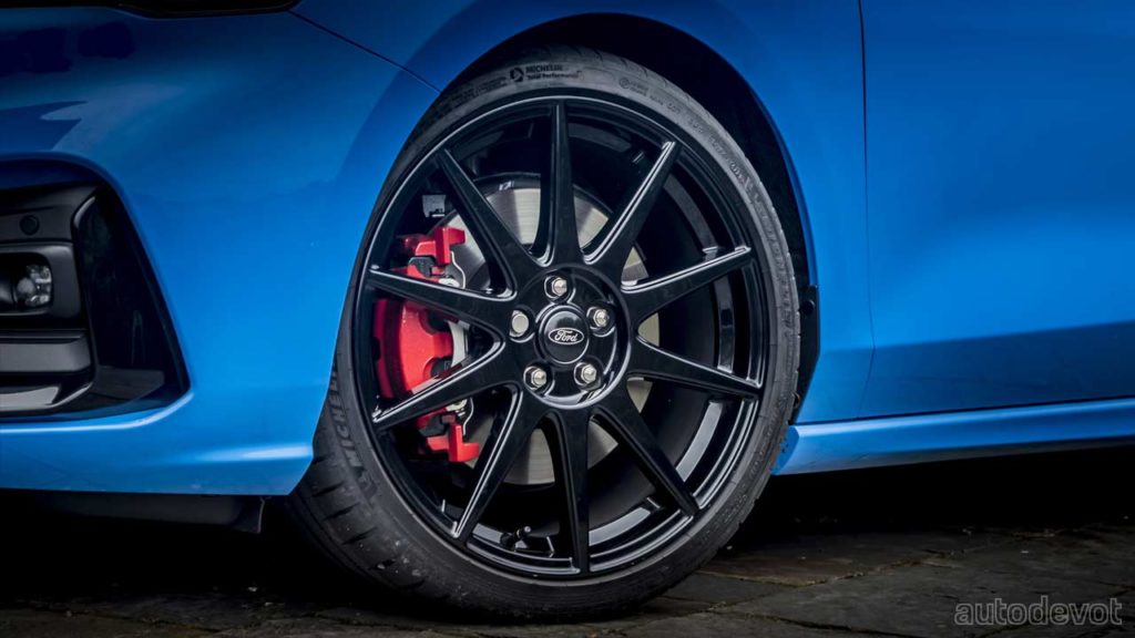 The lightweight 19-inch alloy wheels are wrapped with Michelin Pilot Sport 4S tyres as standard. The wheels are said to reduce unsprung mass by 10% at each corner of the vehicle. As for brakes, the front discs measure 330 mm and the rear 302 mm. The Focus ST Edition also boasts an electronic limited-slip differential (eLSD) that uses hydraulically activated clutches to redistribute up to 100% of the available torque to the wheel with more traction. It is said to be faster and more precise than a conventional mechanical LSD.