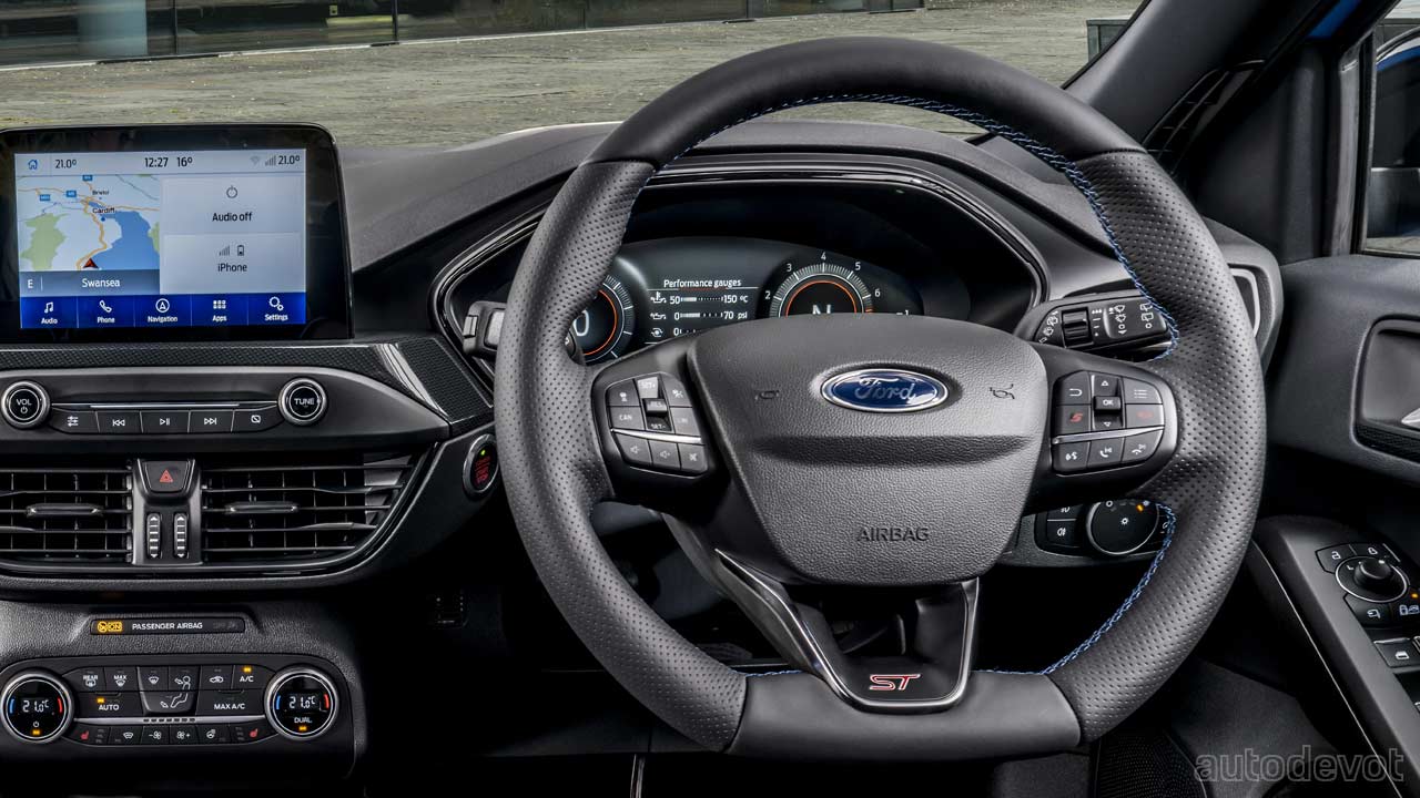 Inside, the Focus ST Edition features part-leather Recaro sports seats as standard with Ford Performance blue stitching. The same stitching can also be found on the gear lever gaiter, centre console knee pads and the ST-branded steering wheel as well.