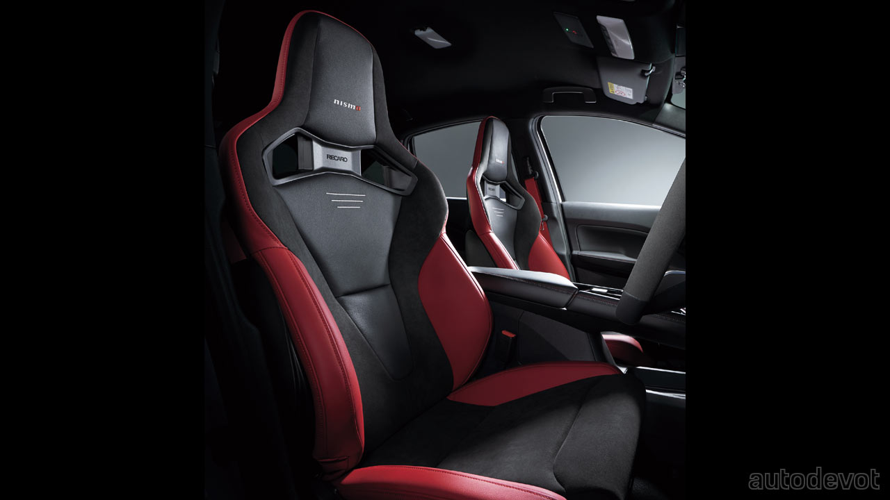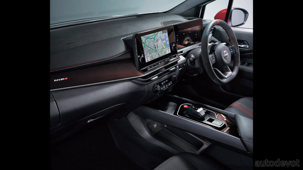 A full black option is also available, but I think it’s the red-black combo that looks pretty sweet. But anyway, inside, there are sporty seats upholstered in a combination of fabric and synthetic leather, with Nismo branding on the headrests. The dashboard and the centre console features carbon fibre-like red-tinted inlays with Nismo branding.