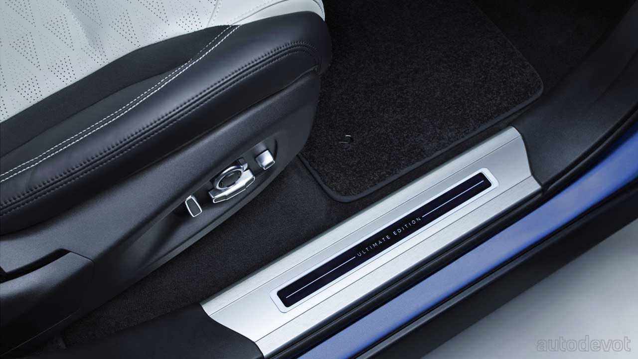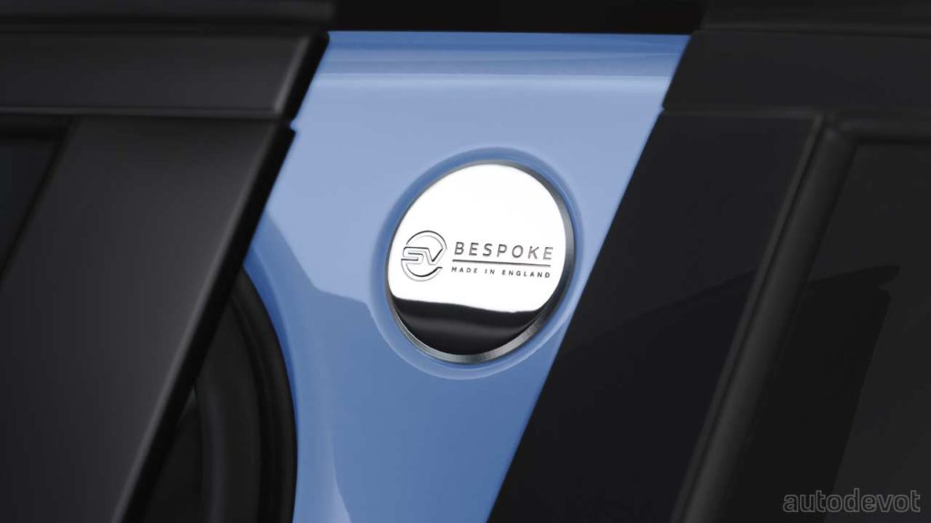 The Ultimate edition is available in three paint finishes: Gloss Maya Blue or Gloss Marl Grey with fine white glass flake particles for a sparkling effect, or a stealthy Satin Ligurian Black. Each colour combines a gloss Narvik Black contrast roof. Other details include a knurled Range Rover lettering on the bonnet and tailgate—with Fuji White edging—which is also used on the black side fender accents. A body-colored carbon fibre vented bonnet, 22-inch five-split-spoke forged alloy wheels, black brake calipers round off the Ultimate treatment.