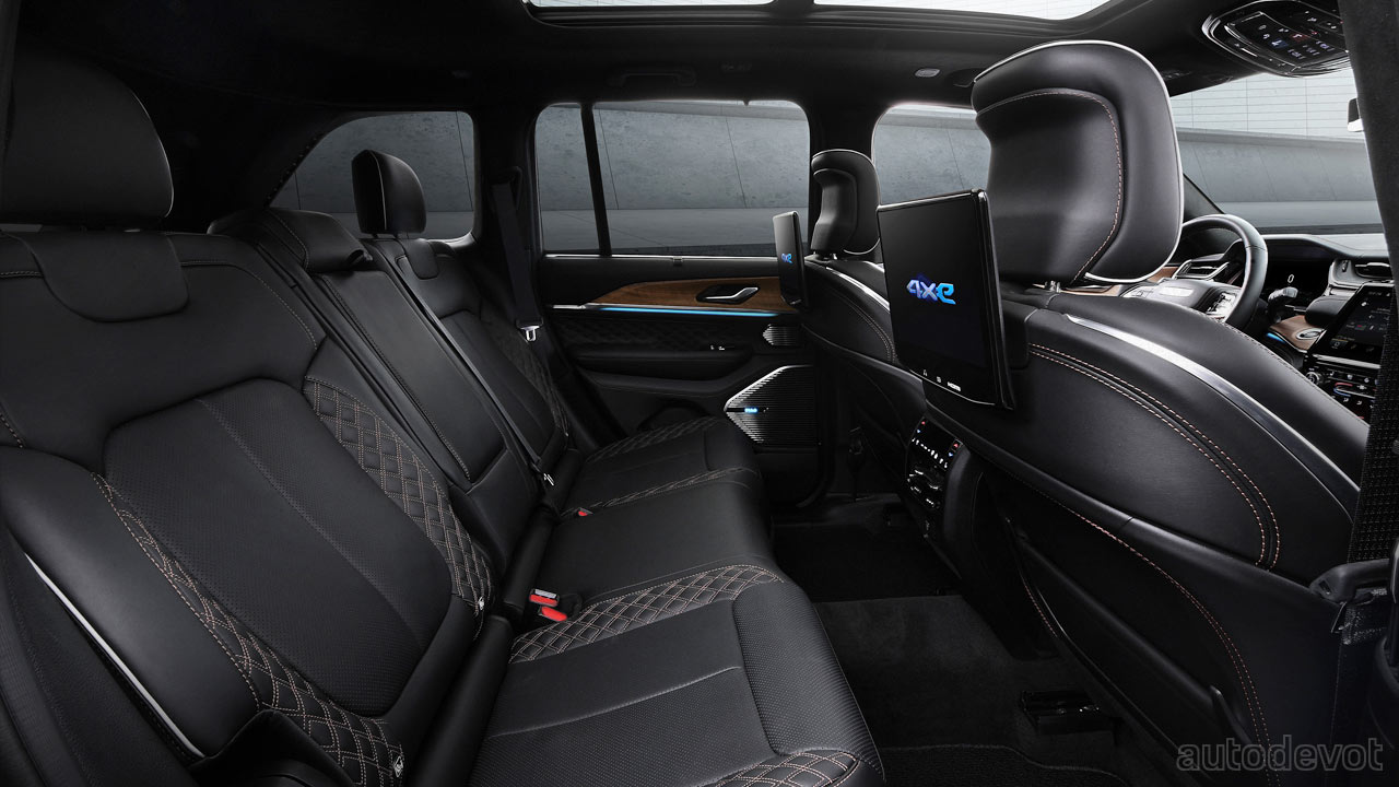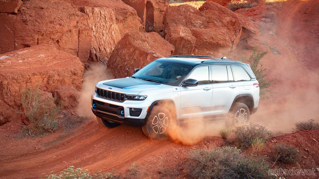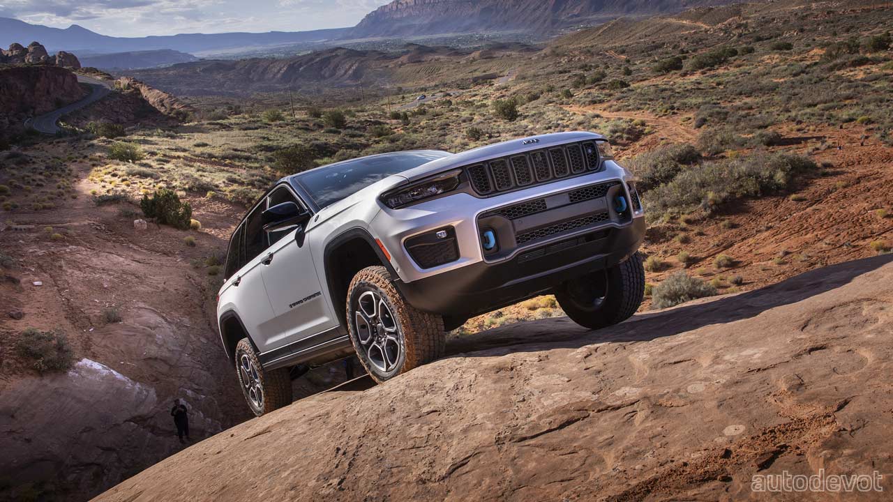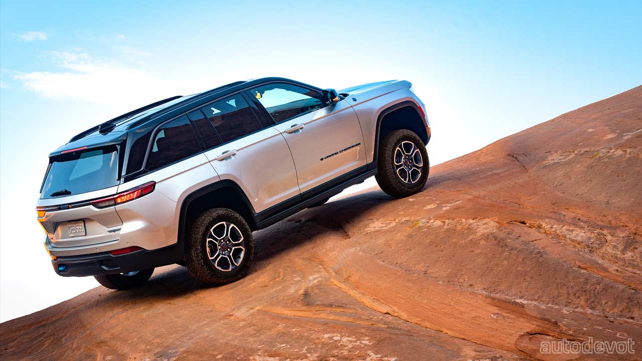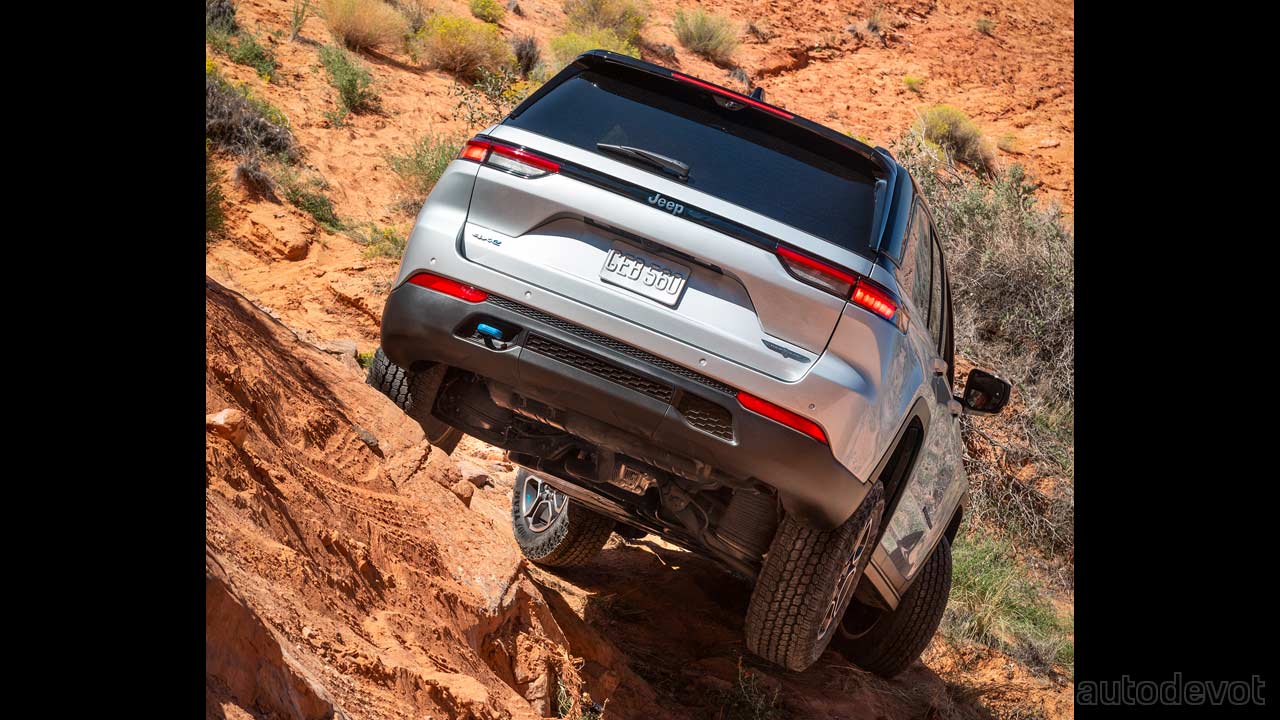 Other key highlights of the Grand Cherokee Trailhawk 4xe include 18-inch wheels with all-terrain tires; 10.9-inches (27.8 cm) of ground clearance; 24-inches (61 cm) of water fording capability; Quadra-Drive II 4×4 system with 2-speed transfer case and 2.72:1 low-range gear ratio; 47.4:1 crawl ratio; Selec-Terrain traction management system; rear electronic limited-slip differential (eLSD); and up to 2,722 kg (6,000 lbs) max towing capability.