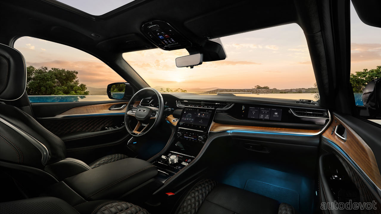 The styling is pretty similar to the Grand Cherokee L; you probably won’t be able to tell the difference until you see the side profile where the L clearly shows its extended length. The three-row Grand Cherokee L boasts a wheelbase of 121.7-inches (309 cm), while the standard-wheelbase model we’re seeing here has a shortage of 5-inches. The overall width, however, remains the same at 84.6-inches (215 cm). The 4xe variant gets some subtle blue accents and decals on the hood as a distinguishing factor. New for the lineup include active grille shutters.