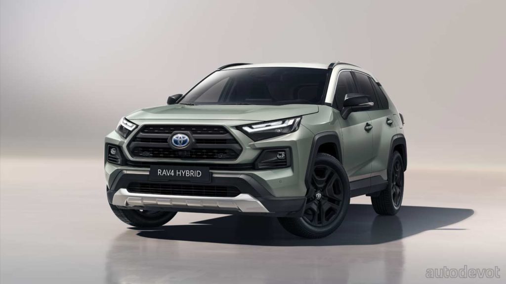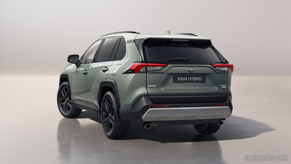 The “RAV4 Adventure leads updates to all RAV4 range for 2022,” Toyota said. Which means some of the changes (except for the “Adventure” bits) you see here will make it to the entire RAV4 lineup; these include new LED headlights with a new running light signature. The RAV4 Adventure wears a new hexagonal dark grille with the Toyota logo positioned in the middle—over horizontal bars. A more sculpted bumper design with silver-ish skid plate, LED front fog lights in black surrounds, thicker wheel arch cladding, 19-inch matt grey alloy wheels, and a matching silver-ish insert on the rear bumper are some of the other highlights. This particular example is painted in Urban Khaki, with roof, A-pillars and rear spoiler in Dynamic Grey, as a homage to classic FJ40 Land Cruisers.
