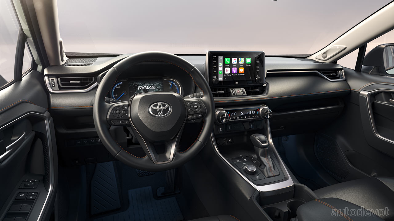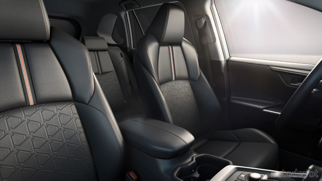Inside, the seats are upholstered in black synthetic leather with a unique design and orange contrast stitching. RAV4 Adventure scuff plates are also part of the package.