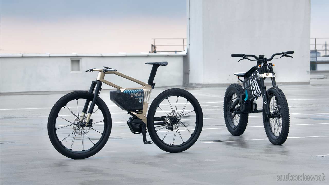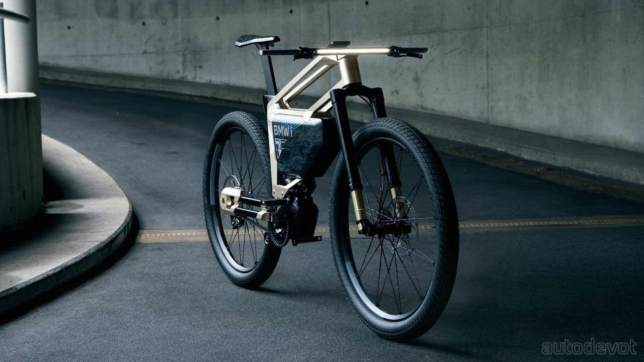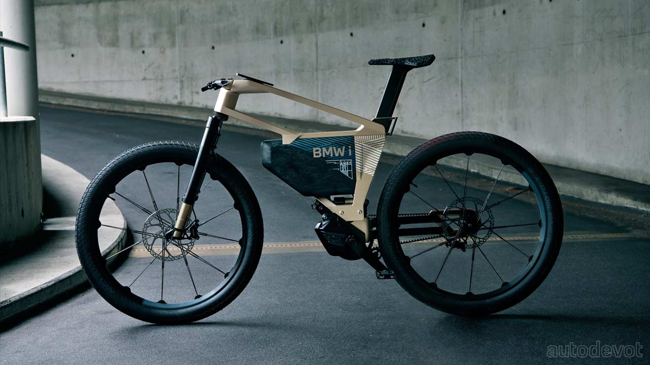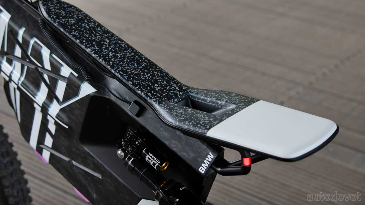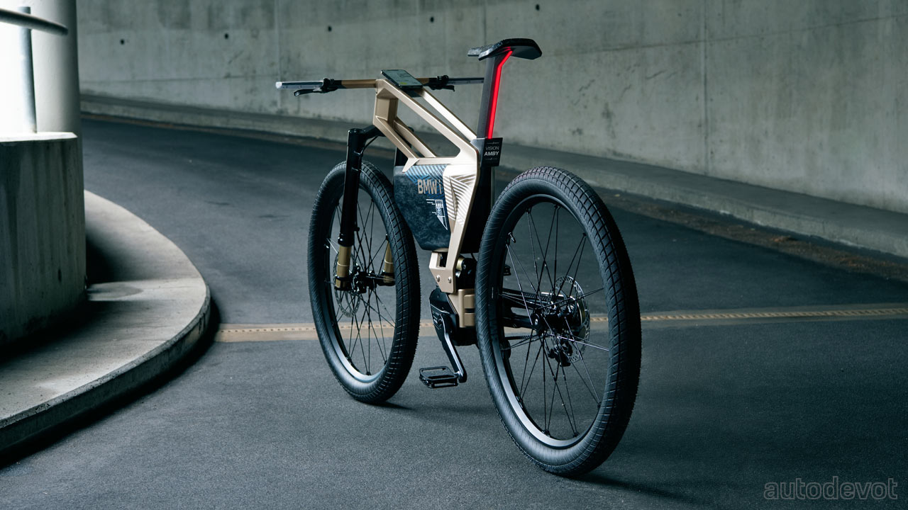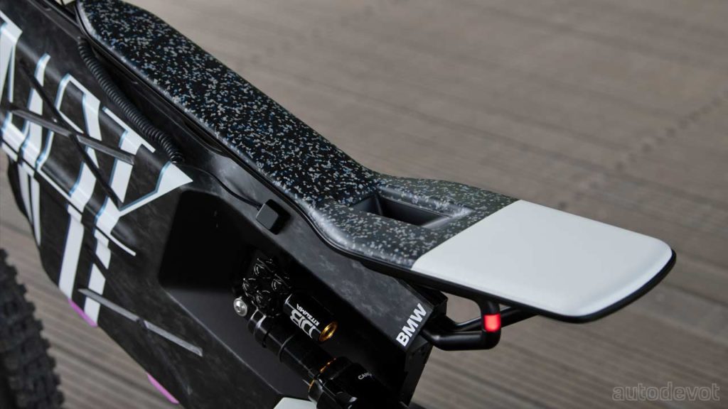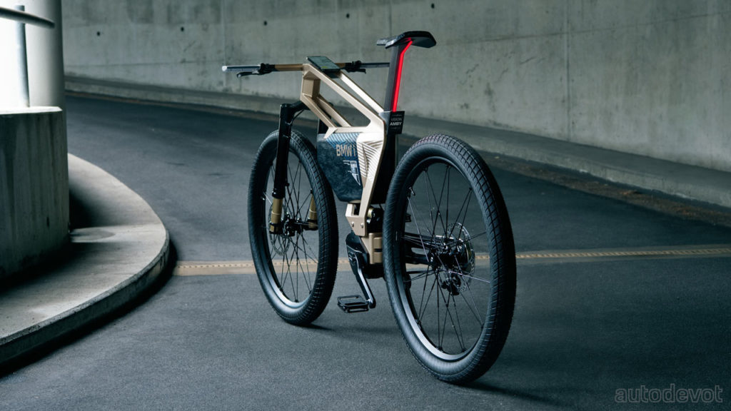 Let’s start with the Motorrad Vision AMBY which according to BMW, is something in between a bicycle and a motorbike. It has a layout of an enduro motorcycle, featuring studded spoke wheels measuring 26-inches at the front and 24-inches at the rear, wrapped with fairly chunkier tyres. The material used for the seating surface and the cover for the energy storage unit is made of recycled plastics.