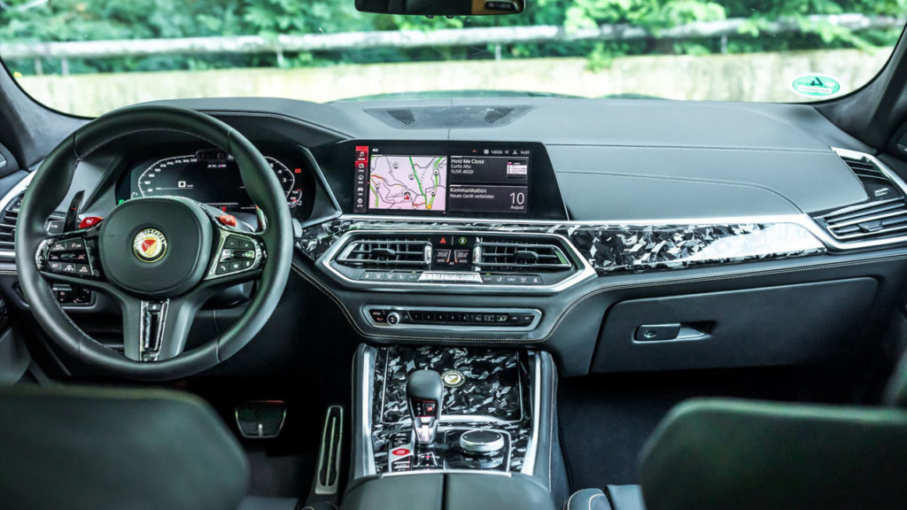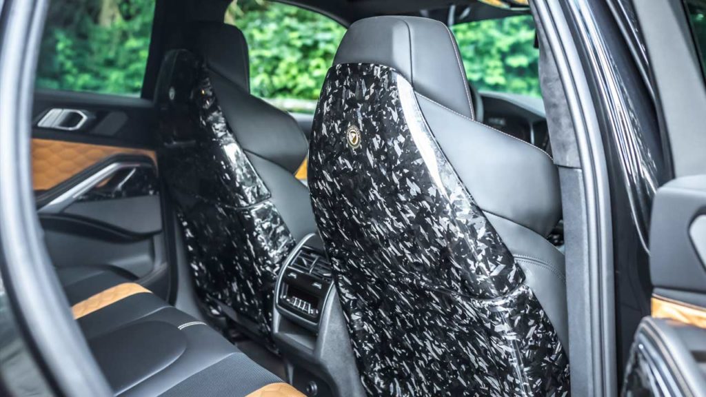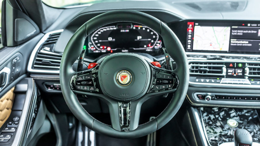 The same artistic forged carbon bits can be found inside as well, on the dashboard, steering wheel, paddle shifters, centre console, seat sides, and seat backs. Manhart floor mats are also part of the package.
