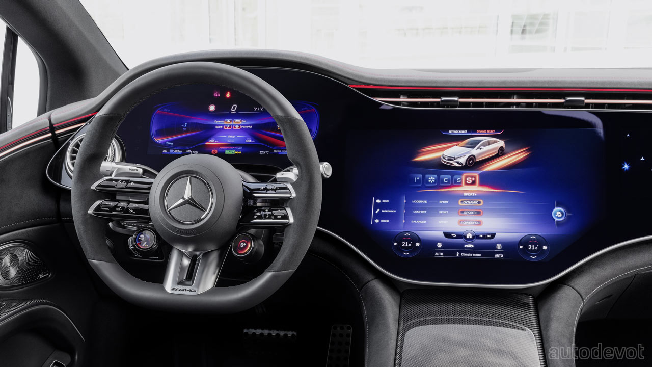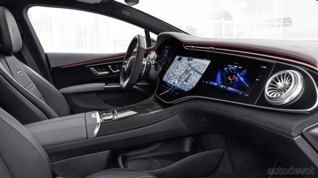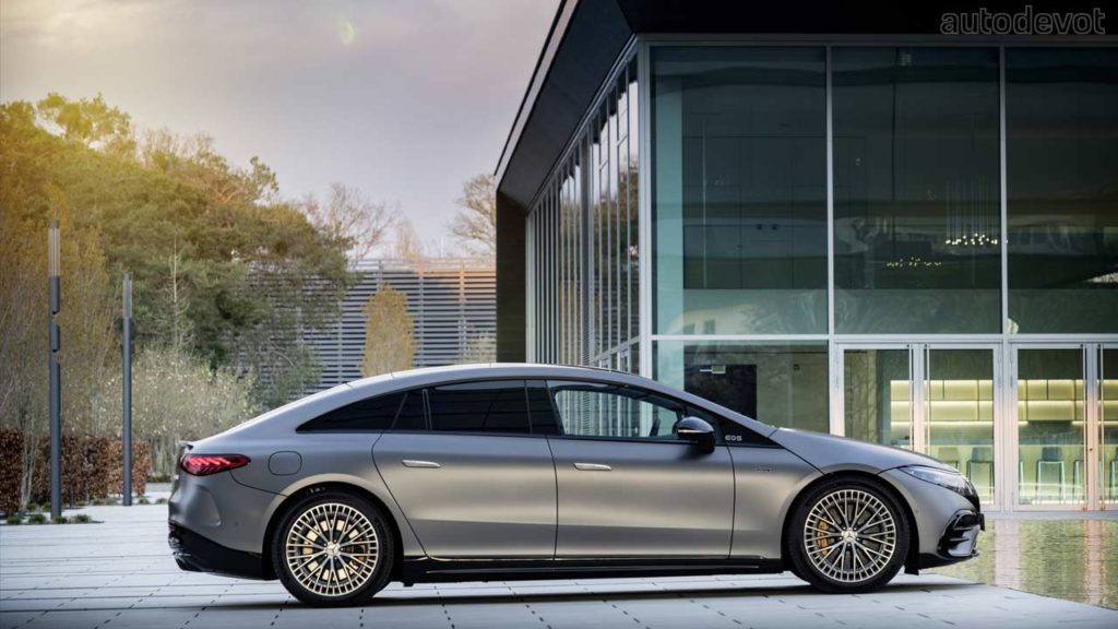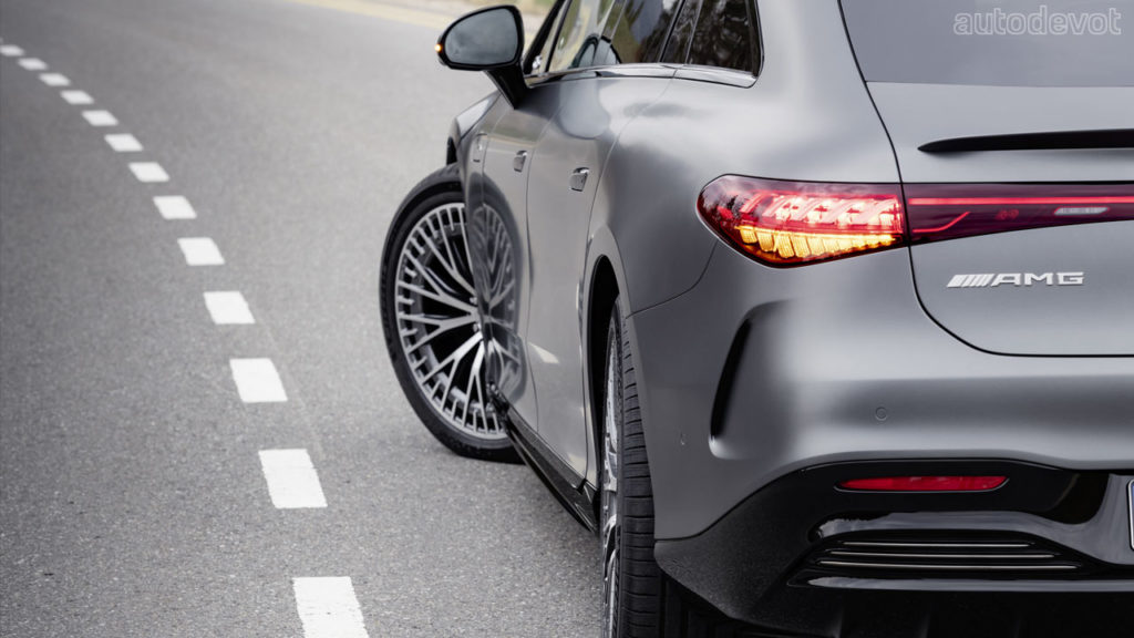 As for the styling, the regular EQS already looked pretty sporty, and so the AMG version doesn’t need to try very hard. All it needs is an AMG-typical Panamericana mimicking grille, gloss-black side sill inserts, a slightly larger bootlid spoiler, and a couple of AMG badges. The rest all are good to go as is. Standard features include Digital Light headlights, rear-axle steering, AMG Ride Control+ suspension (air suspension system with adaptive dampers), and a high-performance compound braking system with discs measuring 415 x 33 mm at the front and 378 x 22 mm at the rear.