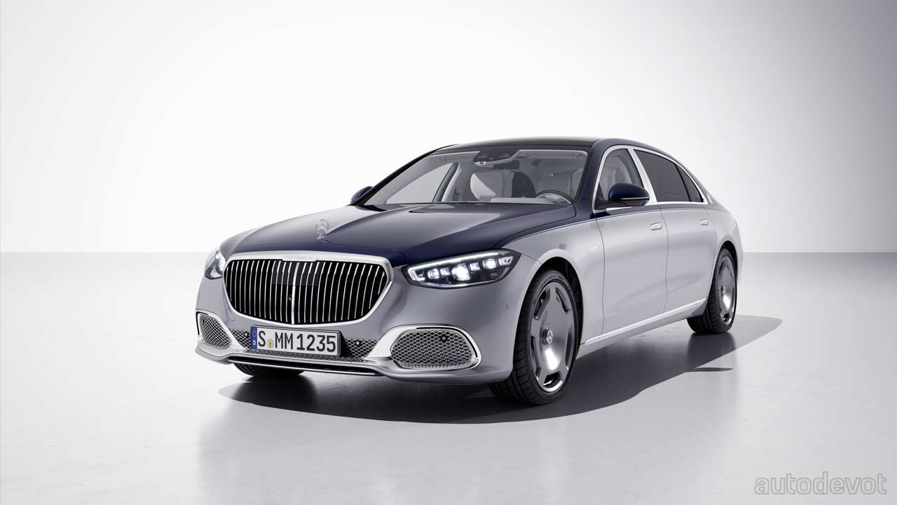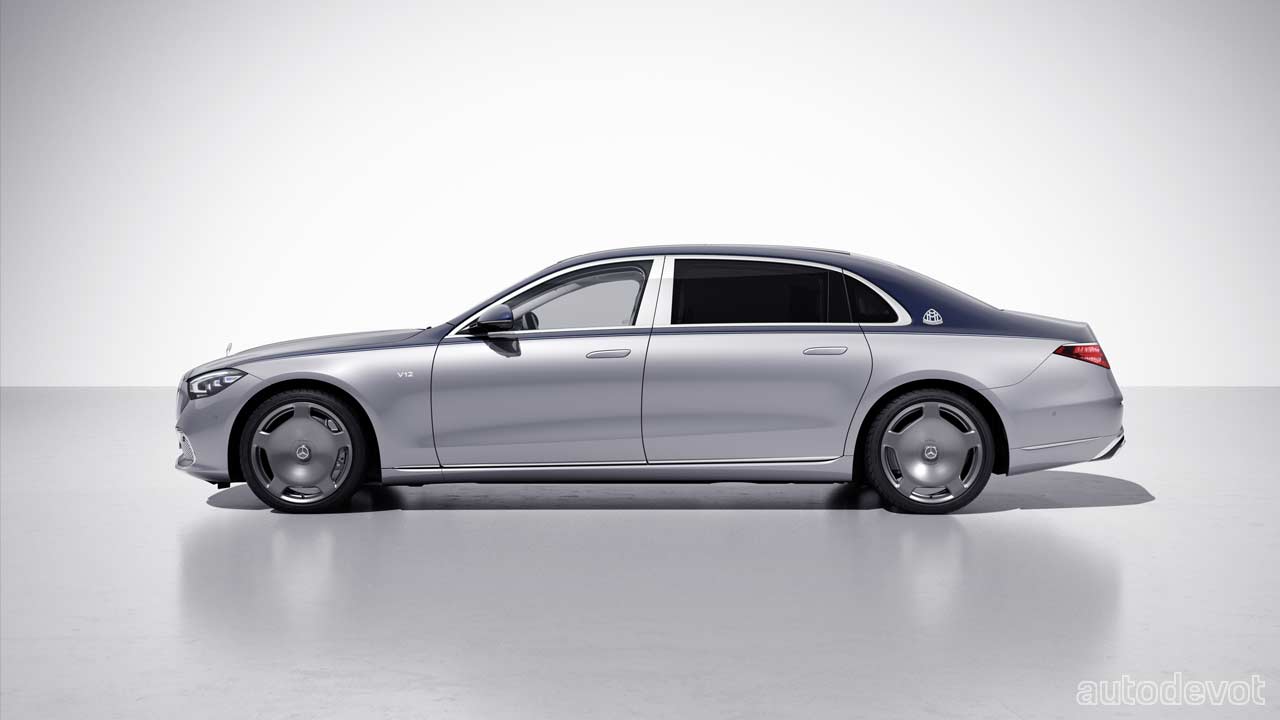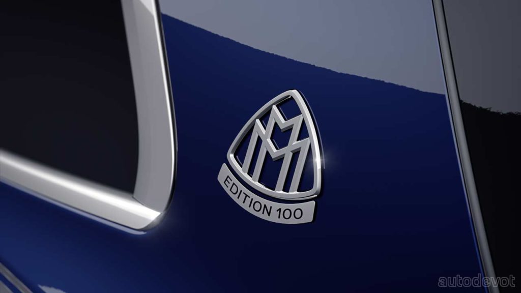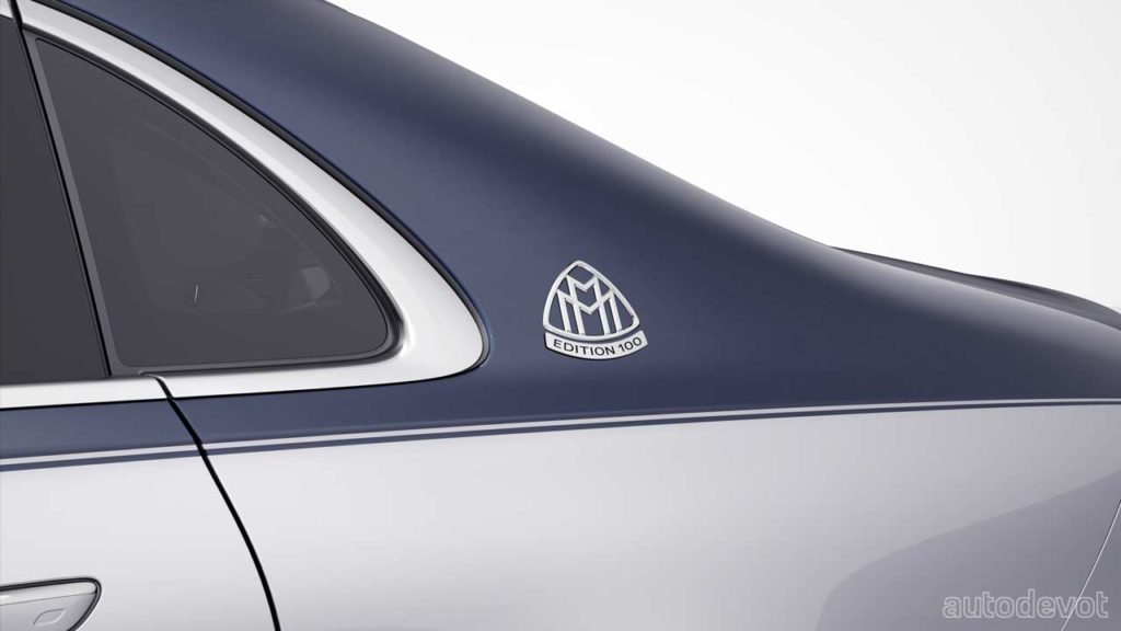 The S 680 4Matic Edition 100 is painted in high-tech silver and nautical blue two-tone scheme. The brand logo with the inscription “Edition 100” adorns the C-pillar, while the hub caps of the grey finished forged wheels are also decorated with “Edition 100” lettering.