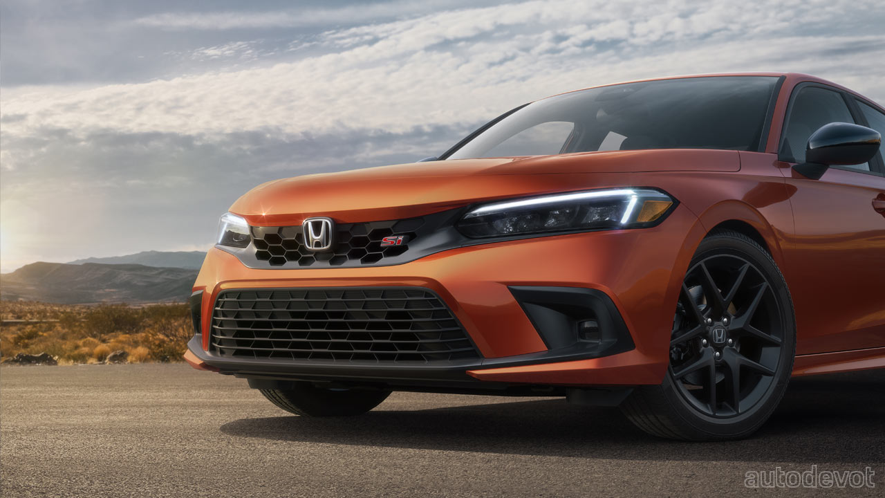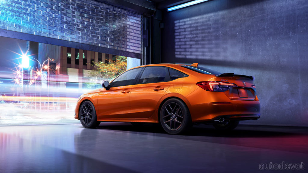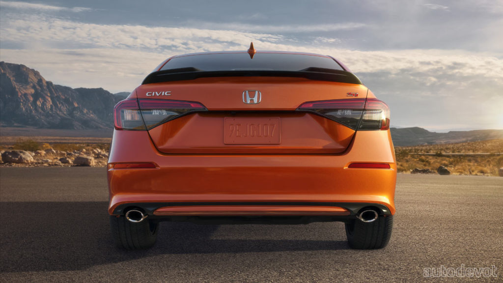 Visually, the Civic Si features a honeycomb pattern on the upper grille as opposed to a generic grille on the regular model. It also gets black elements including the mirror caps, window line, and a spoiler atop the trunk lid. Notice the oval exhaust tips. And yes, the alloy wheels are 18-inch ones finished in a Si-specific matte black. As for the body colors, this particular example is finished in an optional Si-exclusive Blazing Orange Pearl paint.
