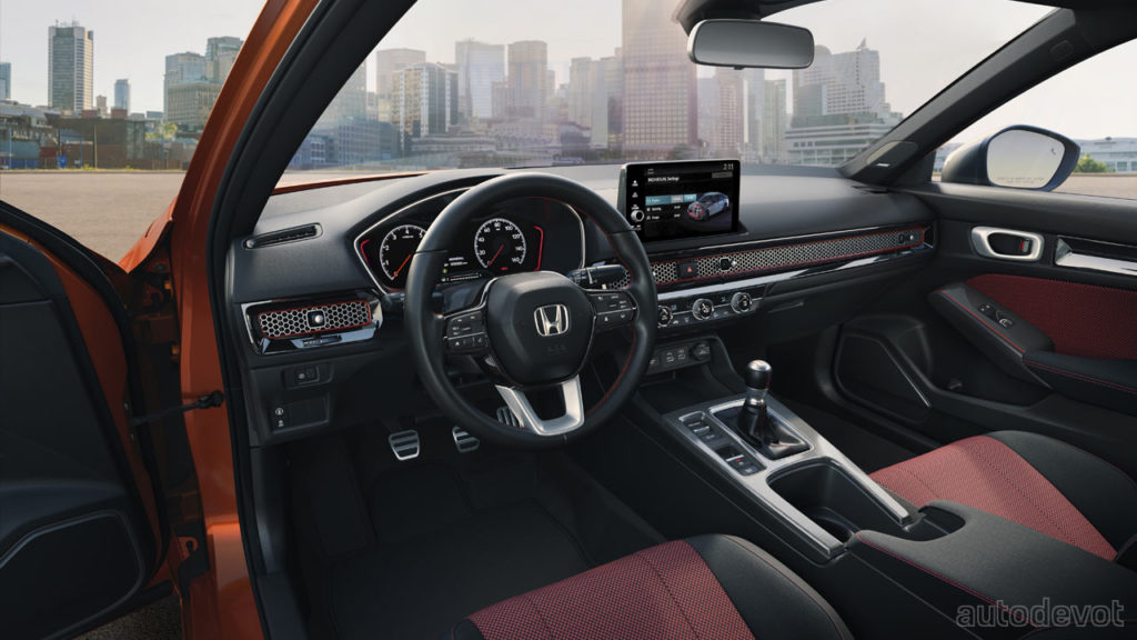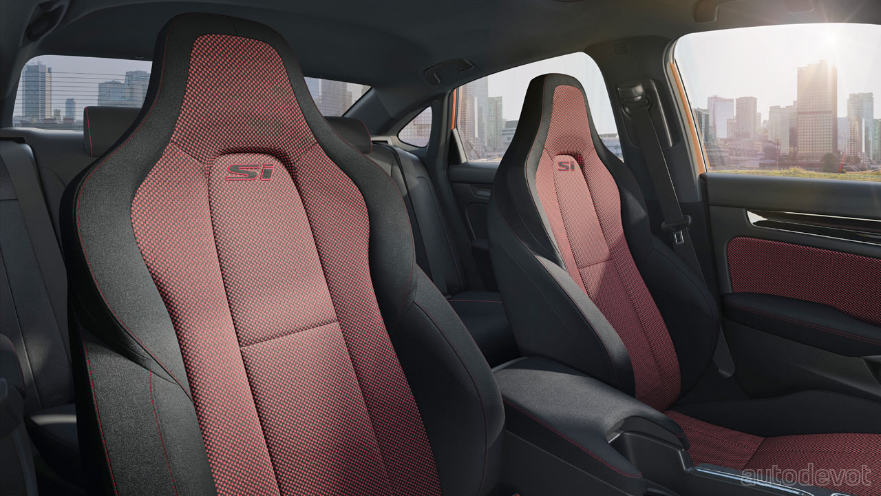 Inside, the 2022 Civic Si features Si-exclusive sport seats with integrated headrests. The lower cushion has been raised by 0.5-inch at the front, which is claimed to offer even better thigh support and reduce fatigue on long drives. Other features include sport pedals; red contrast stitching; a 7-inch color instrument display with a physical speedometer dial; a 9-inch touchscreen; wireless Apple CarPlay & Android Auto connectivity; and a 12-speaker Bose premium sound system.