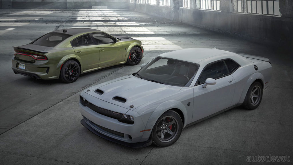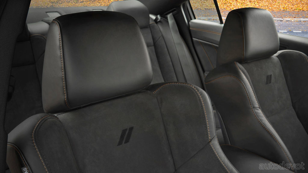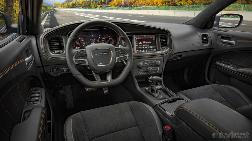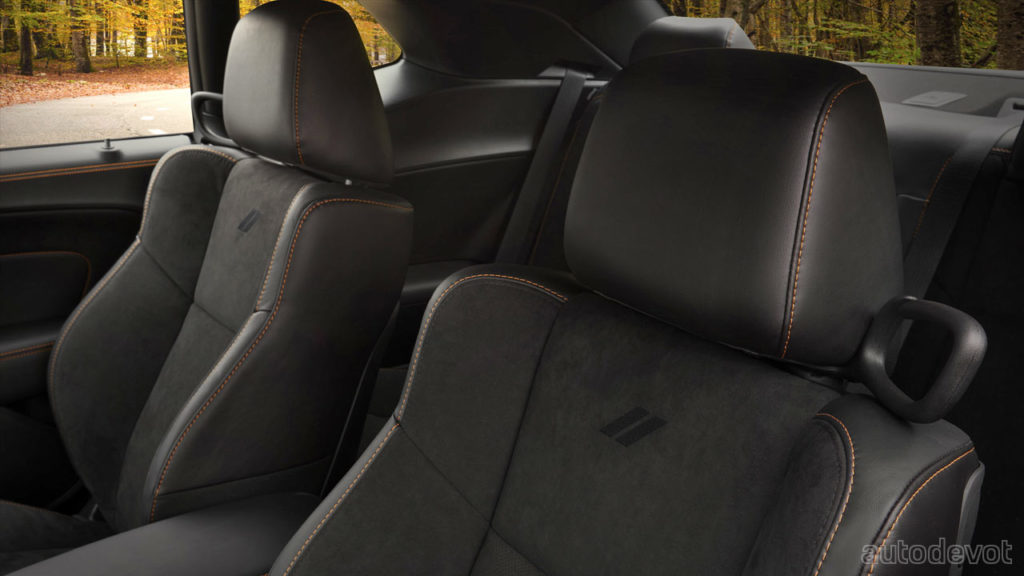 The dark-themed cockpit features orange contrast stitching on the dashboard, door uppers and armrest, console lid, shifter boot, steering wheel, and also on the seats. Speaking of seats, the backrests feature a monochromatic Dodge Rhombi logo. For Scat Pack Widebody, an orange-and-black “392” badge adorns the dashboard.