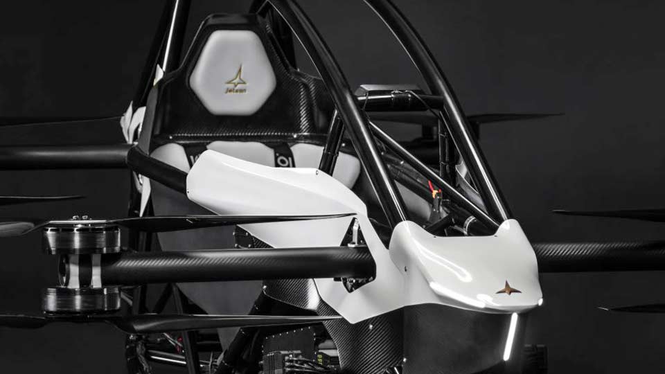 Speaking of which, as you can see, it’s a fairly compact contraption where the frame is built around a sporty bucket seat. The “race-car-inspired spaceframe” as Jetson puts it, is a combination of aluminium and carbon fibre panels. The propeller arms are also made of carbon fibre. Safety systems include triple flight computers for redundancy, lidar sensors for obstacle avoidance, and a ballistic parachute as well.