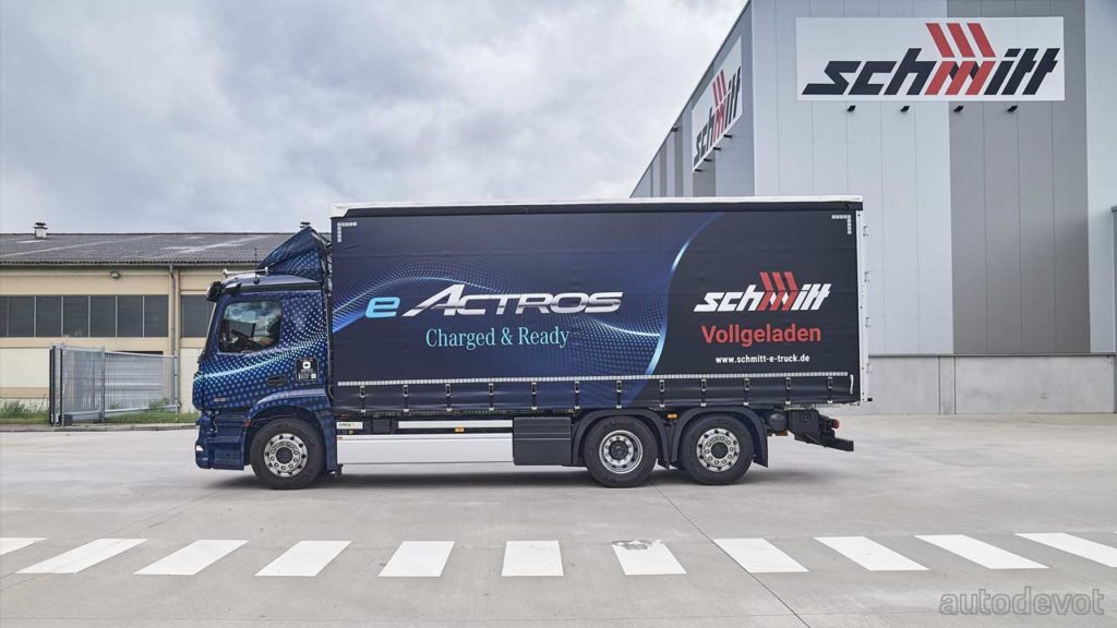 Logistik Schmitt has been testing an early prototype of the eActros since July 2019. According to Rainer Schmitt, the company’s Managing Partner, the eActros has reliably travelled around 70,000 km (43,496 mi) to date in all types of weather, and has apparently transported more than 40,000 tonnes of freight so far. The new vehicle is also operating between Rastatt and Gaggenau in a three-shift operation, covering a cumulative 300 km (186 mi) per day. The eActros transports gear housings on its trips to Rastatt, while it carries axle components to Gaggenau.