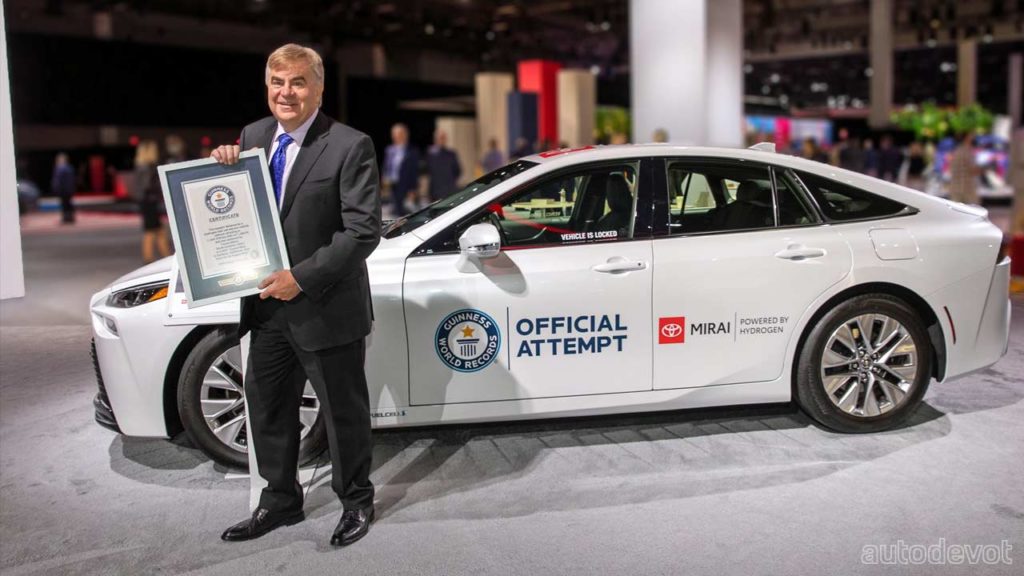 After traveling more than 1,000 km (621+ mi) with just one fill of hydrogen, the second-gen Toyota Mirai has set another record, and this time, it’s a Guinness World Record for traveling 845 miles or about 1,360 km on a single fill of hydrogen. During its two-day tour of Southern California, the Mirai logged an impressive 152 MPGe. Guinness World Record adjudicator Michael Empric validated the Mirai’s tank seal at both the beginning and end of the journey.