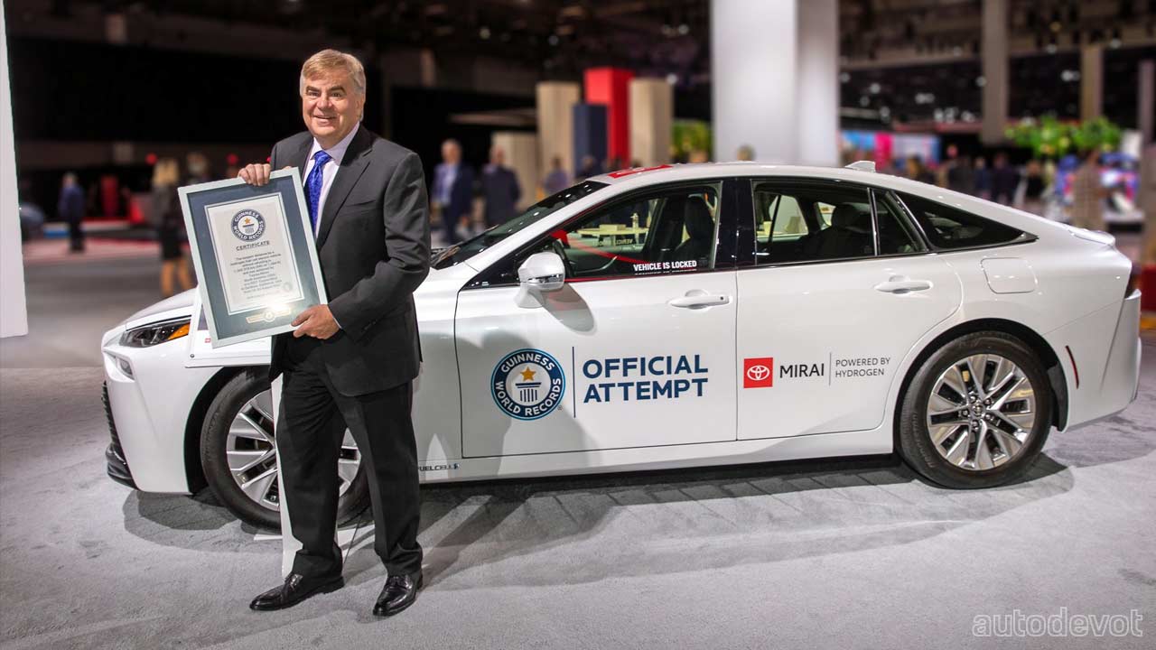 Apparently, the entire record attempt was closely monitored by Guinness World Records, adhering to its strict rules and documentation procedures. Driven by professional hypermiler Wayne Gerdes and co-piloted by Bob Winger, the two-day trip began on Monday, August 23, 2021, at the Toyota Technical Center (TTC) in Gardena, California, home of Toyota’s fuel cell development. The duo traveled south to San Ysidro and then north to Santa Barbara cruising through Santa Monica and Malibu beach along the Pacific Coast Highway. They returned to TTC that evening and logged 473 miles (761 km) with only two driver swaps.