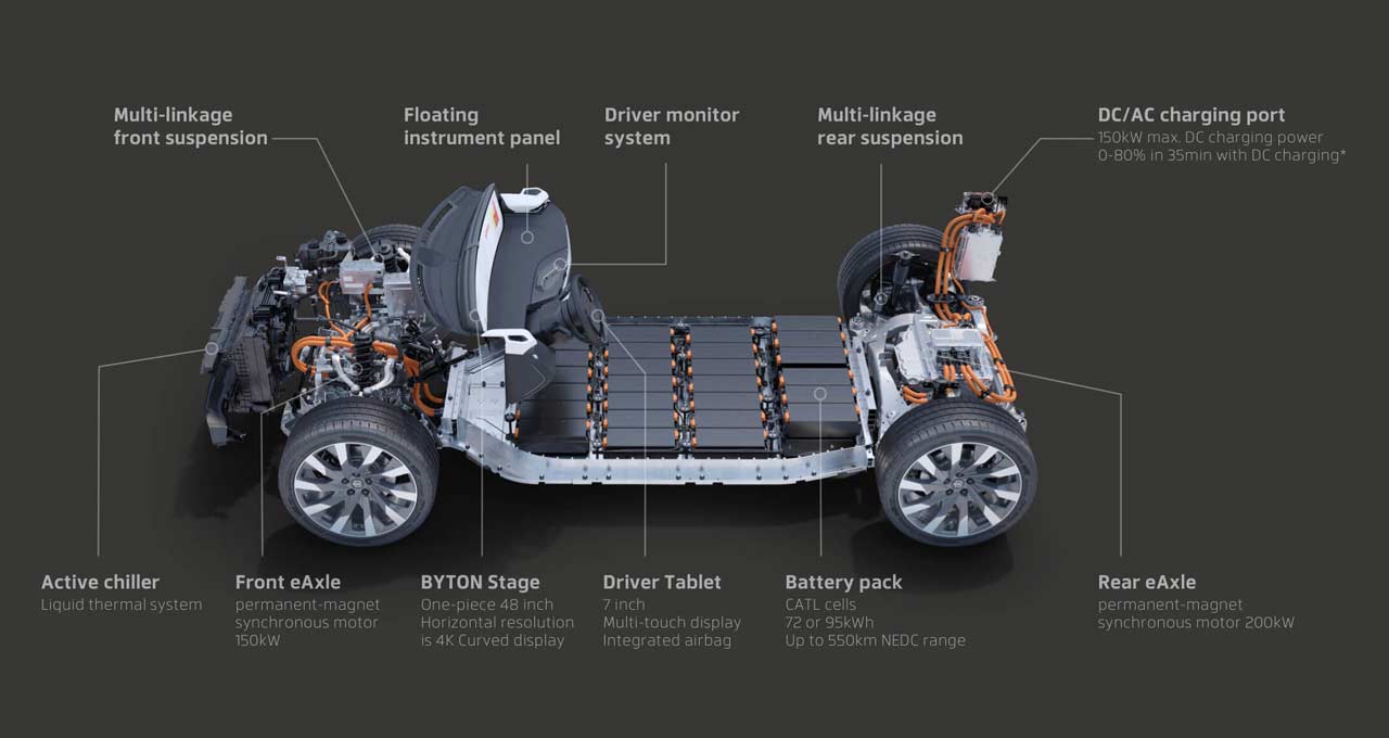 The M-Byte was a promising product (at least on paper). The plan was to offer RWD and AWD variants with 200 kW (272 metric hp) and 300 kW (408 metric hp) outputs, respectively. Depending on the battery pack (72 kWh or 95 kWh), the electric crossover was estimated to offer an NEDC range of up to 550 km (342 mi). A gigantic 48-inch curved display over the dashboard was one of the highlights of the M-Byte.