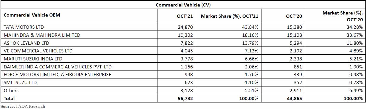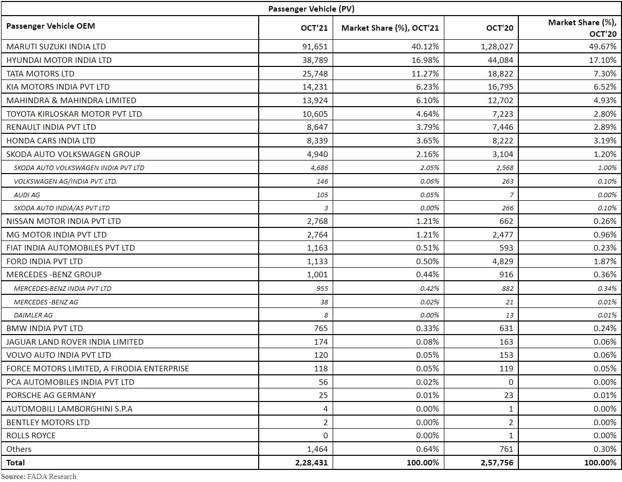 The Federation of Automobile Dealers Associations (FADA) has published October 2021 vehicle retail data, which shows an overall decline of 5.33% compared with October 2020 data. The Passenger Vehicle segment, in particular, saw a YoY decline of 11.38%. And yes, Mahindra & Mahindra lost its 4th place to Kia in the PV segment.