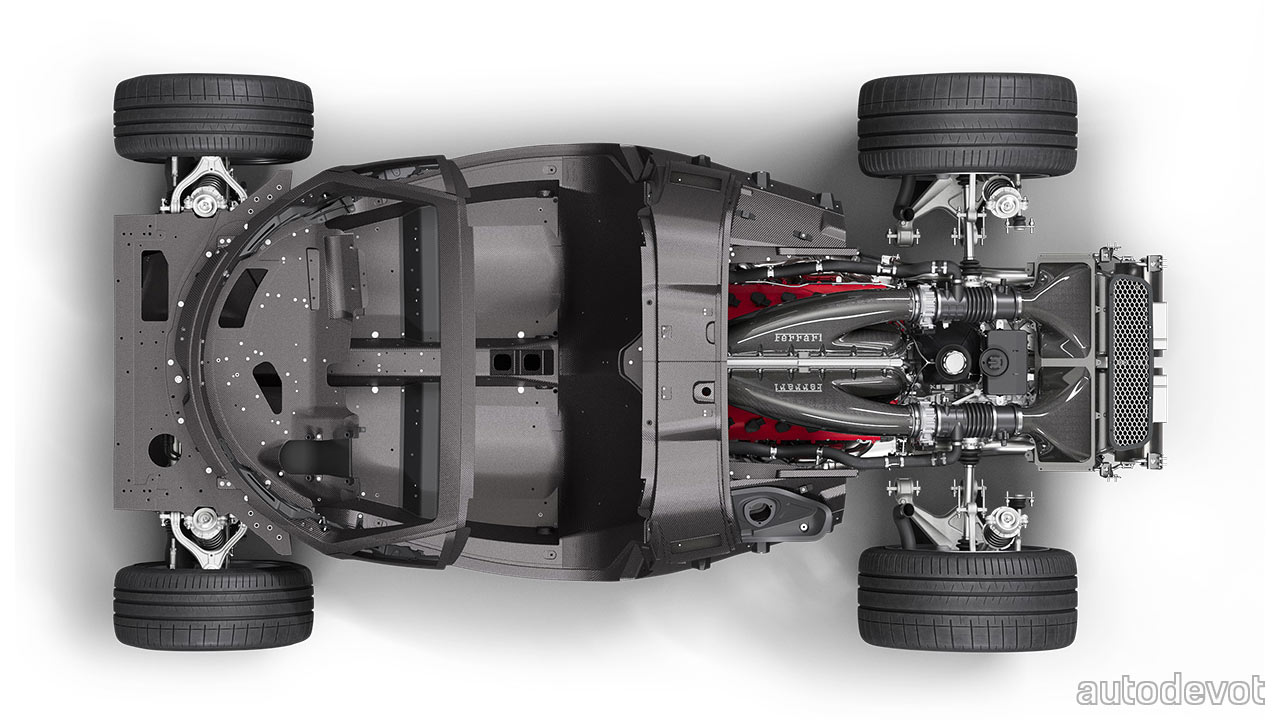 Both the chassis and bodyshell are made entirely from composite materials. The seats are integrated into the chassis itself, resulting in a driving position that is lower and more reclined than in other Ferraris in the lineup. T800 carbon fibre was used for the tub while the doors and sills get T1000 carbon fibre. Kevlar was also used for impact risk areas.