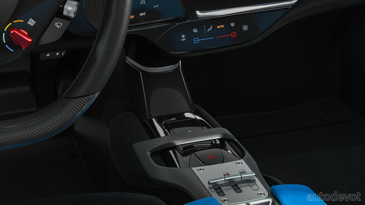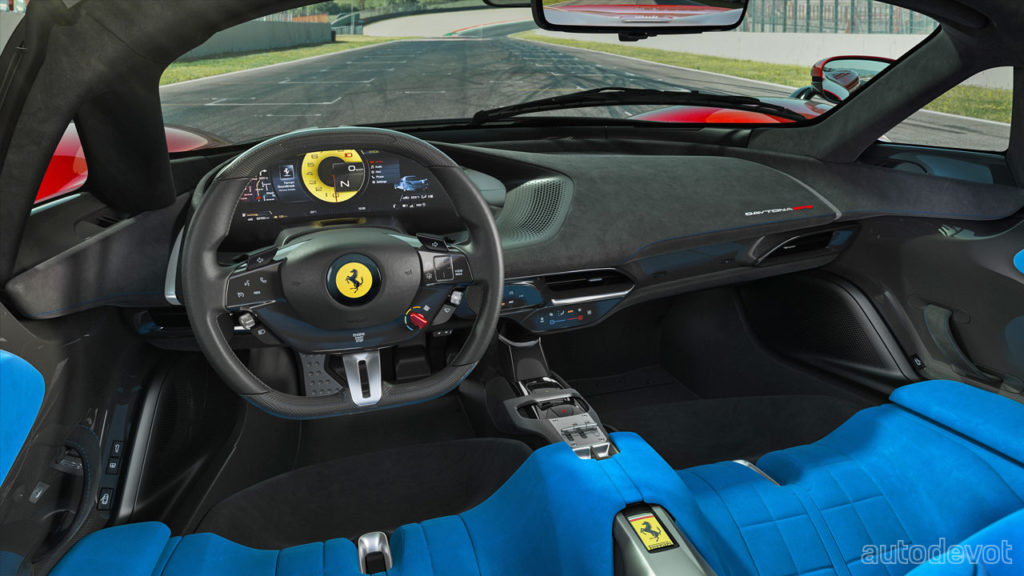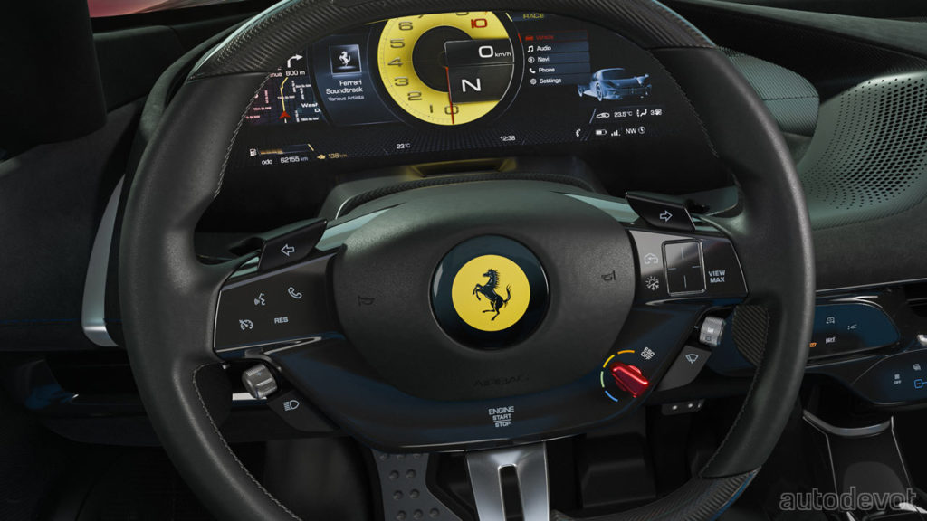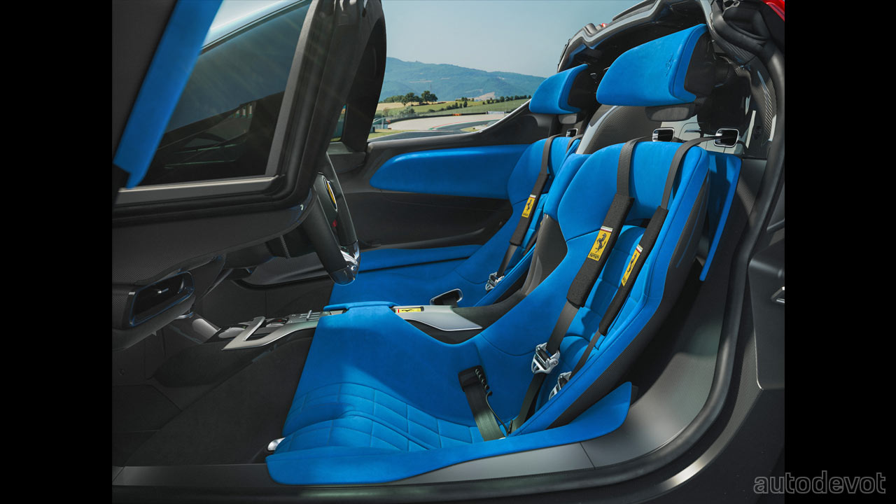 The cockpit features gated shift-mimicking controls in the centre console that debuted on the SF90 Stradale, and there are a bunch of touchy controls on the dashboard and on the steering wheel. The seats don’t appear to be adjustable in any way, but the pedal box is. Which means, the driver seat is expected to be sculpted specifically to the owner’s body—since the Icona series cars are very limited.